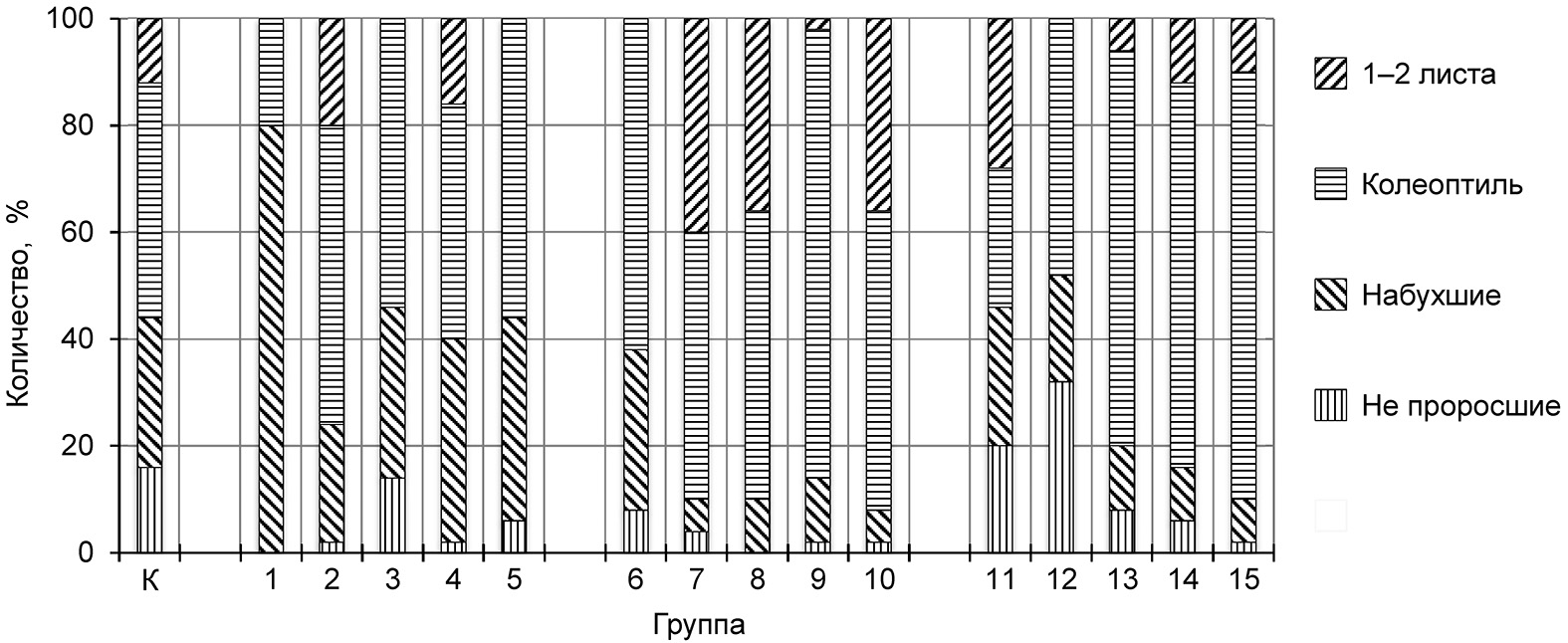 В ходе исследований установили, что на прохождение фаз онтогенеза переменное магнитное поле повлияло положительно для большинства экспериментальных групп растений, а сам биологический эффект имел частотную зависимость (рис. 4). При действии переменного магнитного поля с типом сигнала синусоида (группы № 1–5) и частотой магнитного поля 20 Гц для растений отмечен стимулирующий эффект как на стадии колеоптиль, так и в фазе роста 1–2 листа. Общее значение составляет +20% в развитии. На частотах 30, 40 и 50 Гц получен нейтральный эффект. При частоте поля 10 Гц зафиксировано ингибирующее влияние действующего физического фактора.