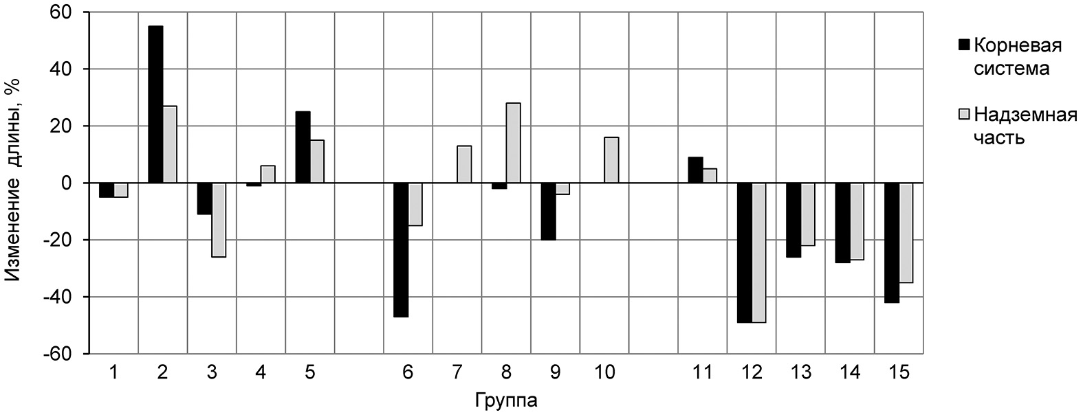 Рисунок 5 – Изменения длины (%) надземной части (проростков) и корневой системы (главного корня) кукурузы сахарной по сравнению с контрольной группой на 8-е сутки эксперимента в зависимости от схемы обработки (см. табл. 1)