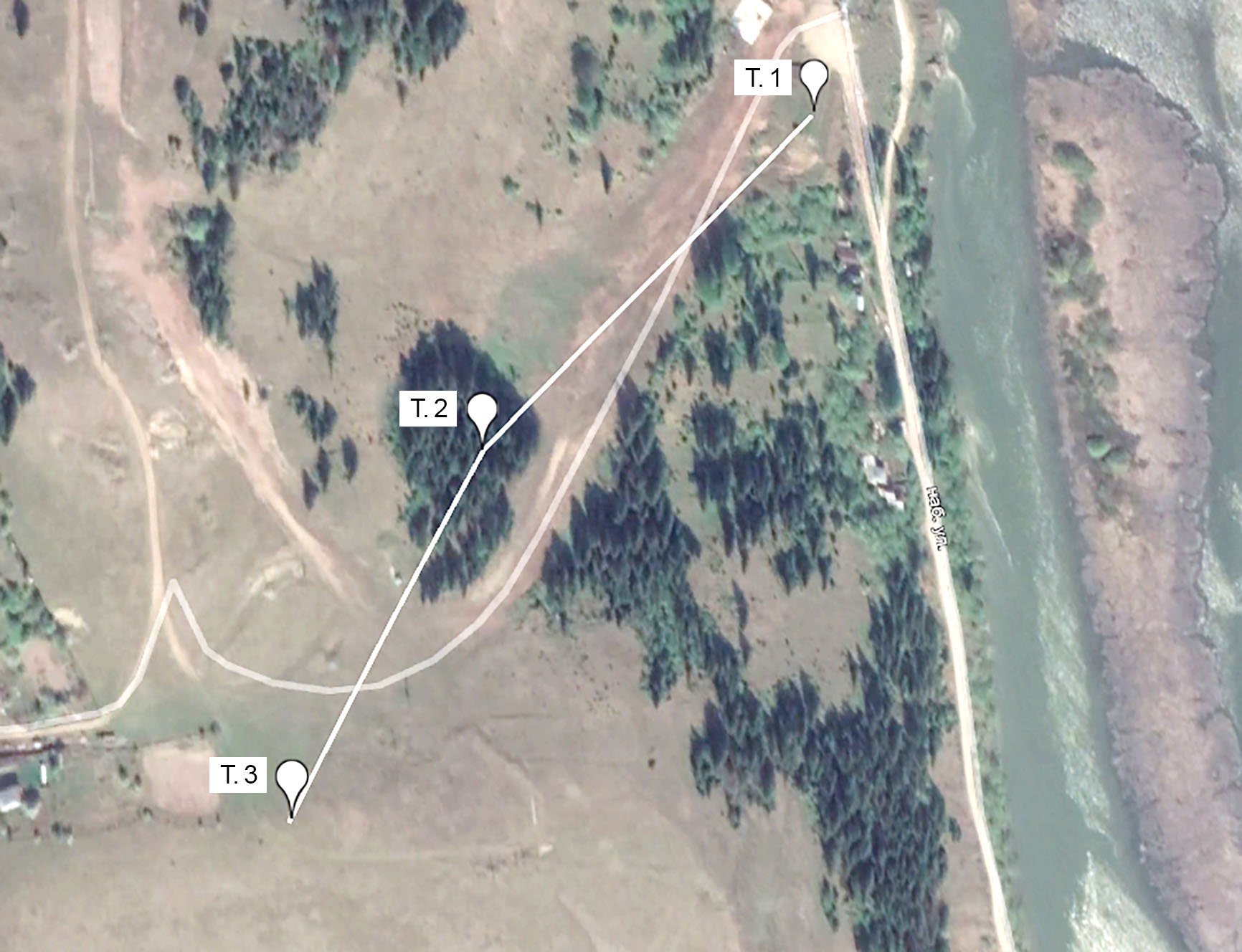 Рисунок 1 – Фрагмент снимка с местом расположения ключевых точек профиля 1–3 (юго-восточный склон г. Ягодная, в окрестностях города Миньяра)
