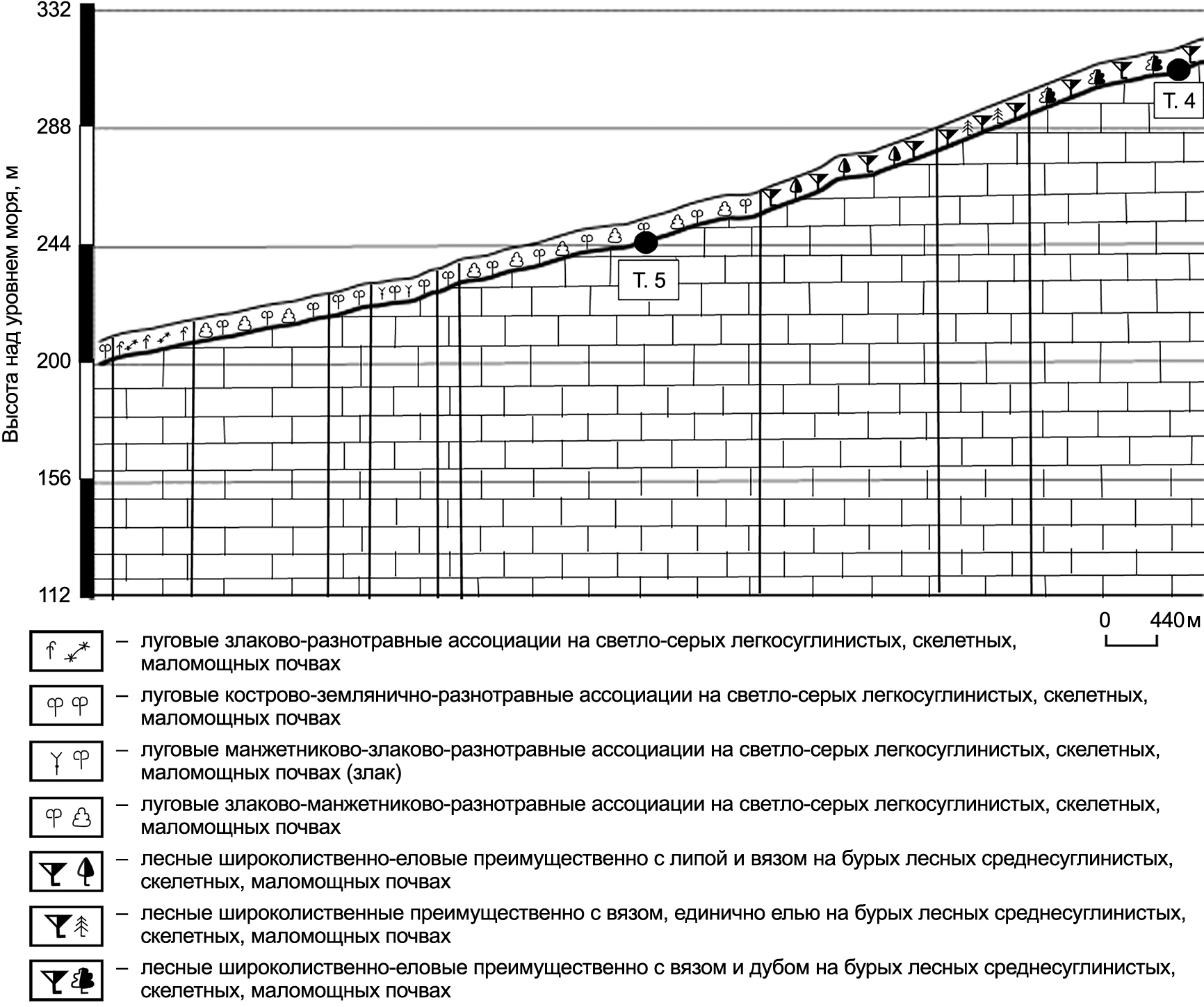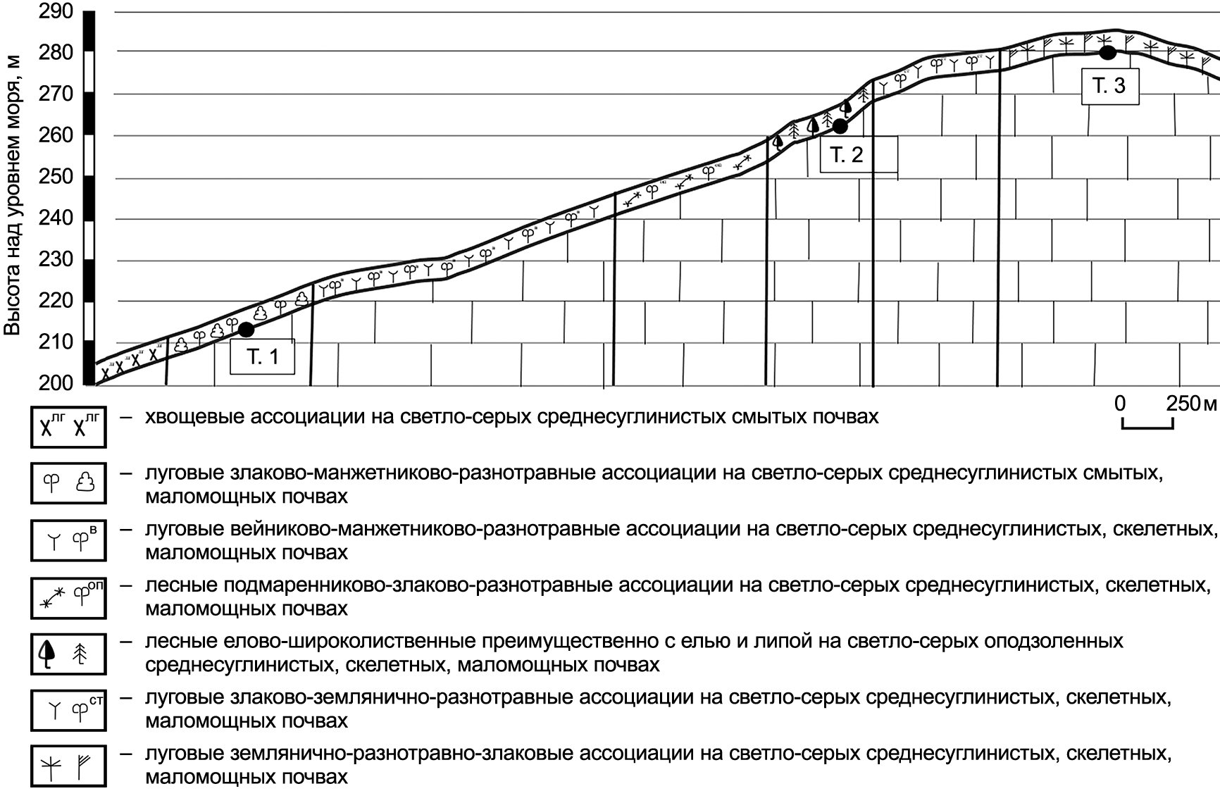 Представленные ландшафтные комплексы (рис. 1) расположены на склоне, имеющем уклон >20°, и меняются от лугово-земляничных, разнотравно-злаковых на водоразделе до манжетниково-разнотравных и хвощевых ассоциаций в понижениях аккумулятивных участках, где происходит вынос вещества и накопление транзитных продуктов в почвенном покрове. В ходе профилирования выявлено, что широколиственные дубовые формации в средней части склона имеют тенденцию к смене на липовые, вероятно, это связано с маломощностью гумусового горизонта, промывным типом режима, высоким затенением надпочвенного покрова, что для размножения дуба является критическим фактором [12, с. 20].