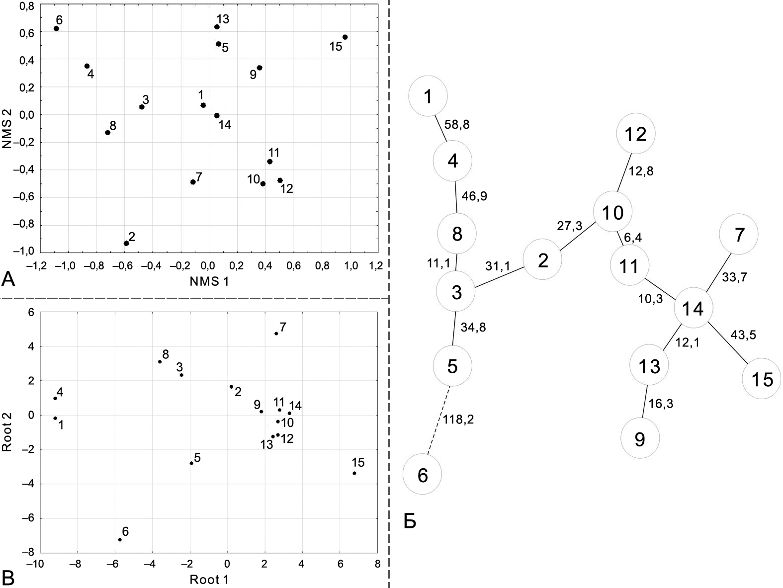 Рисунок 1 – Ординация фитоценохор, формирующихся при естественном зарастании отвалов добычи каменного угля в окрестностях г. Копейска: А – в первых осях неметрического многомерного шкалирования (NMS 1, NMS 2); Б – методом максимального корреляционного пути (цифрами указан квадрат расстояния Махаланобиса); В – в первых осях дискриминантных функций (Root 1, Root 2)