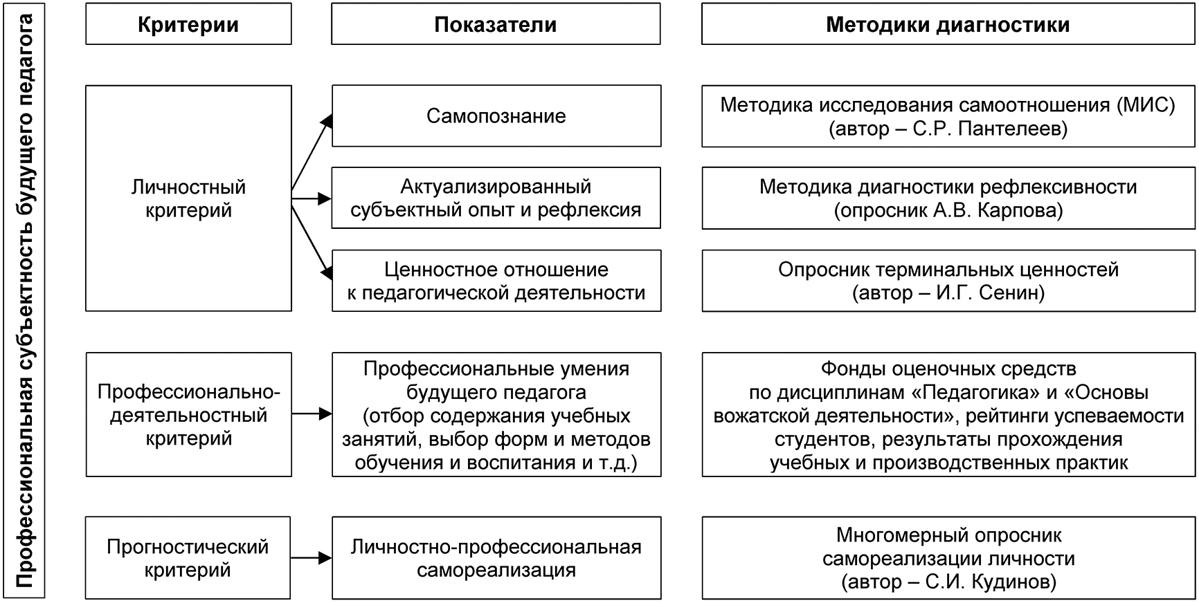Рисунок 1 – Критерии, показатели и методики диагностики профессиональной субъектности будущих учителей