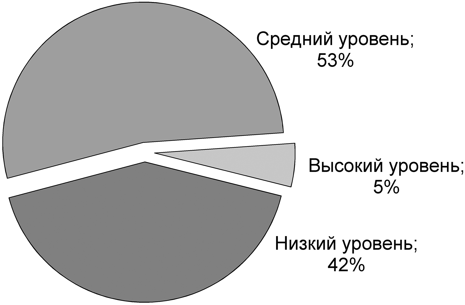 Так, из 170 студентов экспериментальной группы: 71 человек получил оценку в диапазоне 4–10 баллов (низкий уровень), 90 человек – в диапазоне 11–17 баллов (средний уровень), 7 человек – в диапазоне 18–20 баллов (высокий уровень). Как видно, большинство студентов набрали баллы из низкого и среднего уровней. Таким образом, выявлено, что большинство студентов имеют низкий или средний уровень вокально-педагогической культуры. Более наглядно это можно увидеть на рисунке 2.