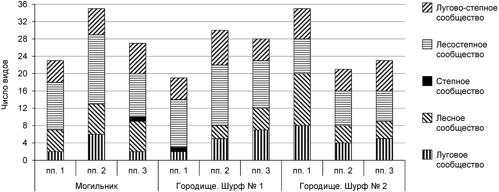 На территории могильника лесостепное сообщество демонстрирует наибольшую плотность (35–45%) и превосходит другие виды сообществ. Лугово-степное сообщество также присутствует, но с меньшей плотностью (15–25%). Адвентивные и рудеральный виды встречаются, но в небольшом количестве (единично, до 8%). На территории городища лесостепное сообщество также преобладает, но его плотность немного ниже (35–40%), чем на могильнике. Лугово-степное сообщество (15–20%) и адвентивные виды (до 3%) также встречаются, но в меньшем количестве. Рудеральные виды присутствует в более высоких количествах по сравнению с могильником (до 13%). На пробной площади № 1 на городище (шурф № 2) отмечено наибольшее количество лесных видов и большее проективное покрытие – 30%, это связано с близкой расположенностью пробной площади к склону оврага, где условия произрастания несколько меняются. На всех трех территориях наиболее распространено лесостепное сообщество, хотя его плотность может незначительно различаться. Типичные степные виды (Stipa pennata L. и Thymus serpyllum L.) встречаются единично (<10 экз. на 100 м²) и прослеживаются на переходе от территории могильника на территорию городища.