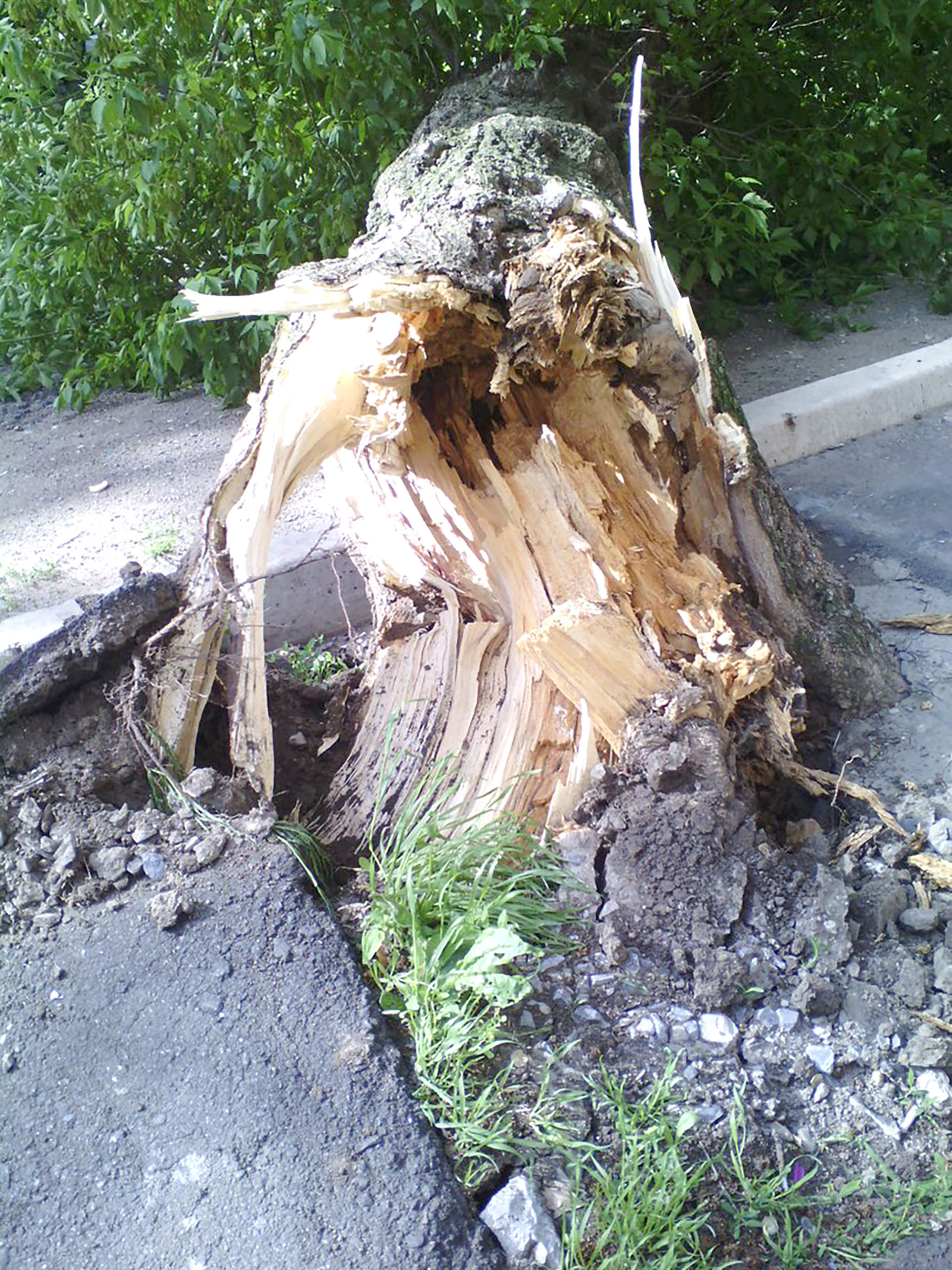 Рисунок 2 – Потеря механической устойчивости после ветровала для Acer negundo L., достигшего критического возраста в условиях городской среды (фотография В.О. Корниенко, 2018 г.)