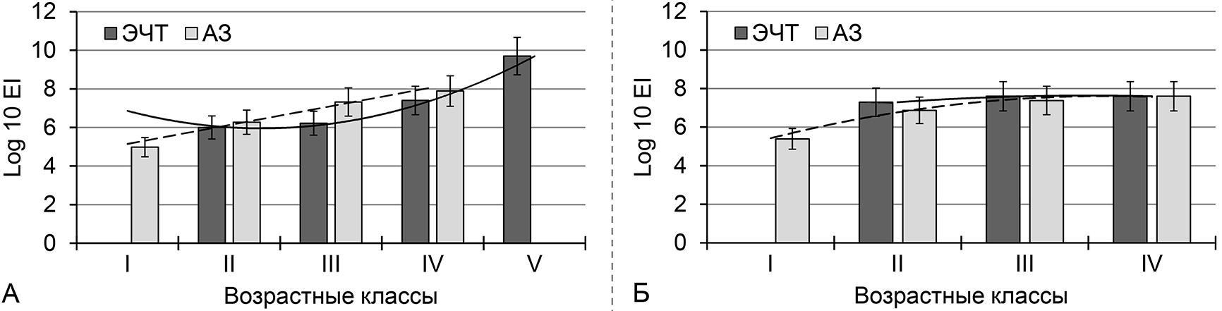 Рисунок 7 – Отношение жесткости на изгиб (EI) стволов деревьев Quercus robur L. (А) и Robinia pseudoacacia L. (Б) для разных возрастных классов