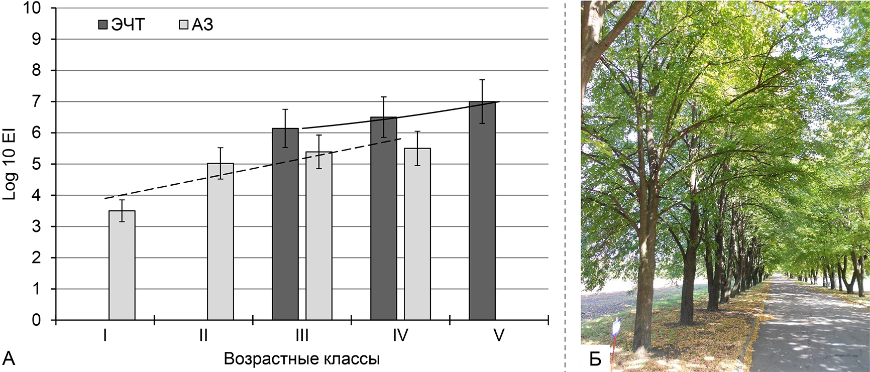 Рисунок 5 – Деревья Tilia cordata Mill. в условиях г. Донецка: А – сопротивление изгибу стволов деревьев (EI) для разных возрастных классов; Б – центральная аллея Донецкого ботанического сада с участием Tilia cordata Mill. (фотография В.О. Корниенко, 2021 г.)