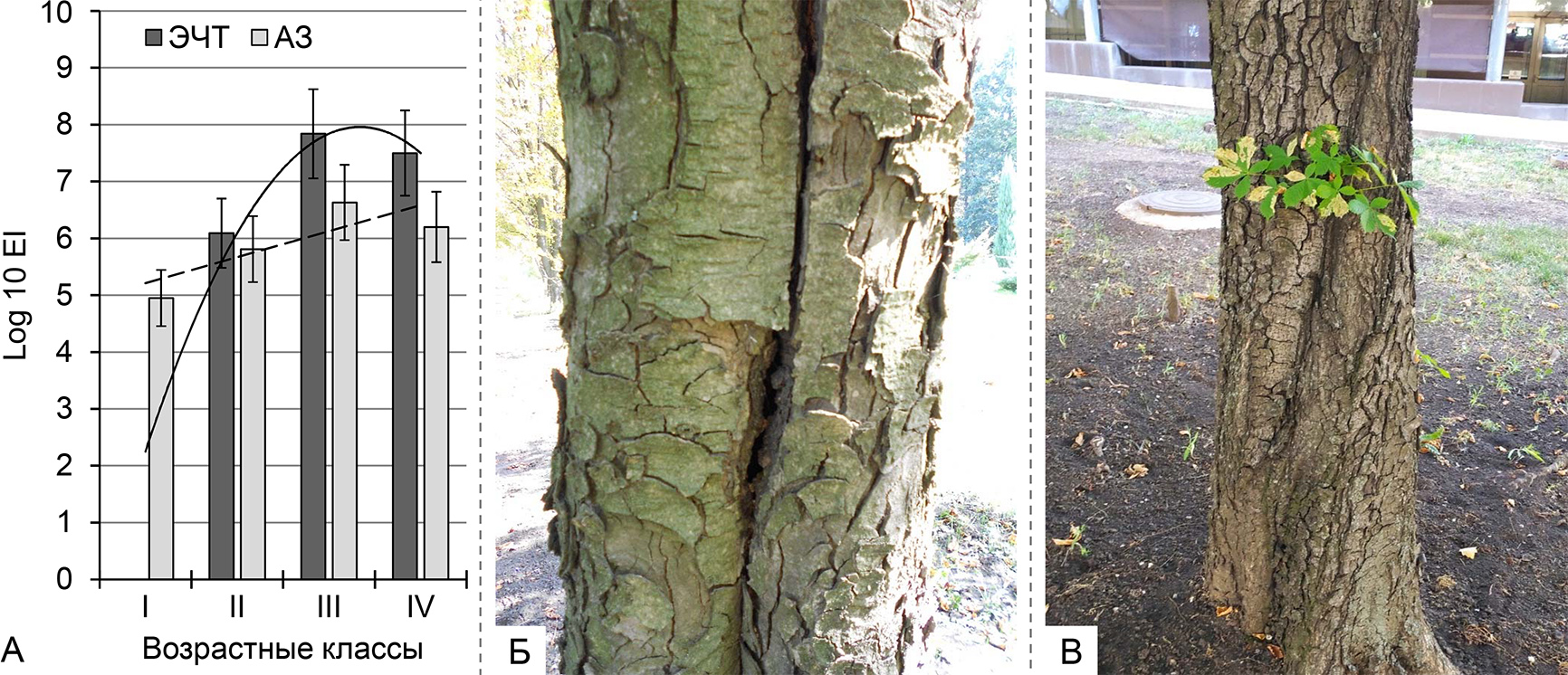 Рисунок 6 – Деревья Aesculus hippocastanum L. в условиях г. Донецка: А – сопротивление изгибу стволов деревьев Aesculus hippocastanum L. для разных возрастных классов; Б – типичное повреждение ствола деревьев Aesculus hippocastanum L. независимо от условий произрастания – открытые морозобоины с признаками заселения вредителями, начало процесса развития ядровой гнили (фотография В.О. Корниенко, 2021 г.); В – типичное повреждение ствола деревьев Aesculus hippocastanum L. в виде закрытой радиальной трещины (заросшей), возникающее под действием циклических процессов заморозки/оттаивания (фотография В.О. Корниенко, 2024 г.)