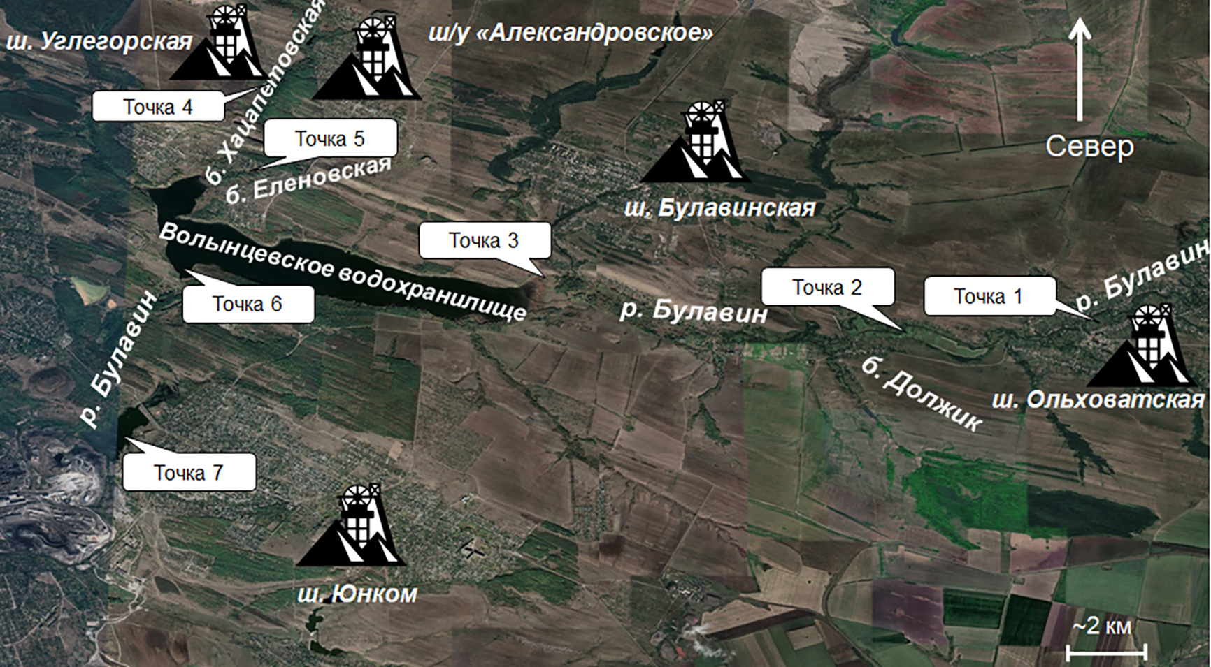При исследовании состояния поверхностных вод Волынцевского водохранилища мониторинговые точки выбирали таким образом, чтобы наиболее полно учесть все возможные источники загрязнения. Потенциальными источниками загрязнения являются сточные шахтные воды шахт № 3 ш/у «Александровское», «Углегорская», «Булавинская» и «Ольховатская». Всего было выделено семь мониторинговых точек (рис. 1). Точка 1 располагается на русле р. Булавин, точки 3 и 6 – на территории водохранилища. Точка 2 расположена на территории балки Должик на русле реки Булавин. Мониторинговые точки 4 и 5 расположены на территории балок Хацапетовская и Еленовская, куда также попадают шахтные воды. Ниже по течению р. Булавин, после водохранилища образовано два искусственных проточных водоема, в которые попадают промышленные стоки (точка 7).