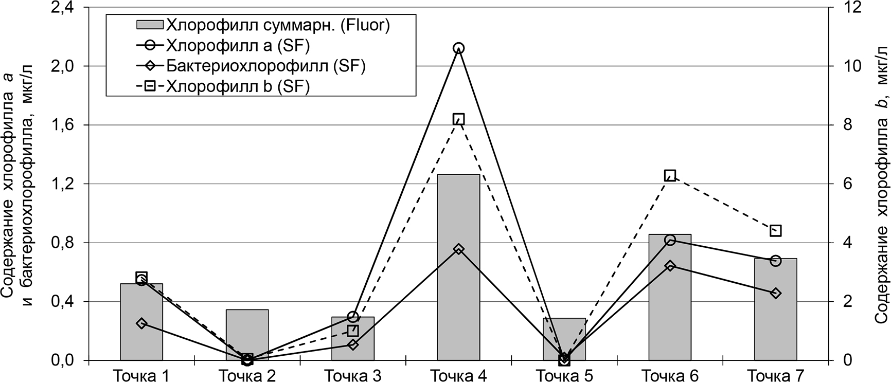 Для всех исследуемых мониторинговых точек было характерно преобладание хлорофилла b, чему способствует доминирование диатомовых микроводорослей (рис. 2; табл. 2).