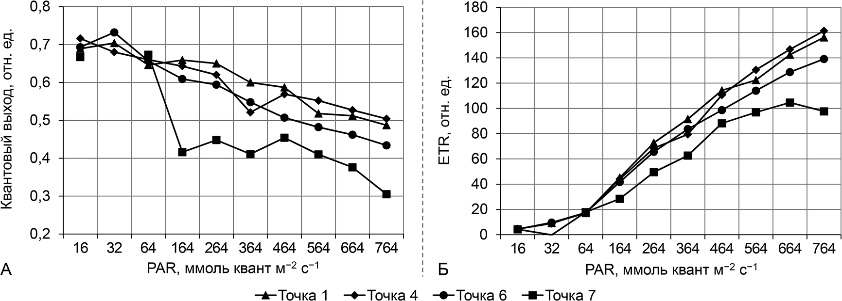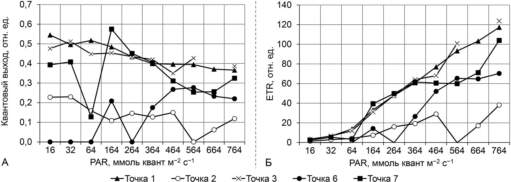 Рисунок 3 – Световые кривые квантового выхода флуоресценции хлорофилла a (А) и скорости электронного транспорта – ETR (Б)