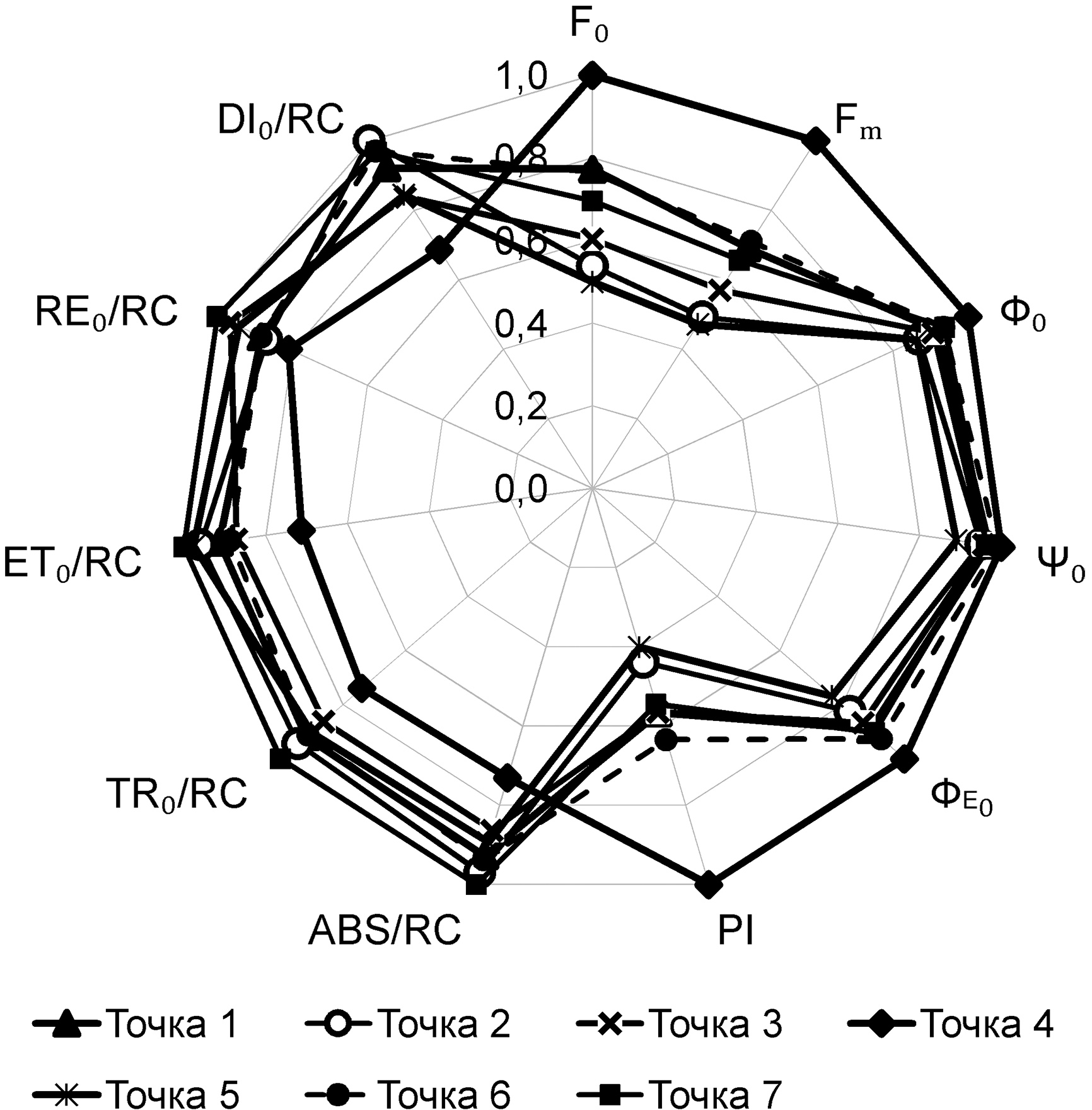 При анализе кривых индукции флуоресценции был выявлен ряд показательных тест-функций: базовые показатели флуоресценции – F₀, Fₘ и Ф₀ = Fᵥ/Fₘ [9, p. 661–662; 18, p. 452–453; 10, с. 90], параметры эффективности работы фотосинтетического аппарата – Ψ₀, ФE₀ и PI [10, с. 93, 95; 18, p. 452–453], специфические потоки энергии через реакционный центр (РЦ) фотосистемы II (ФС II) – DI₀/RC, RE₀/RC, ET₀/RC, TR₀/RC и ABS/RC [10, с. 91–92; 23, p. 88].