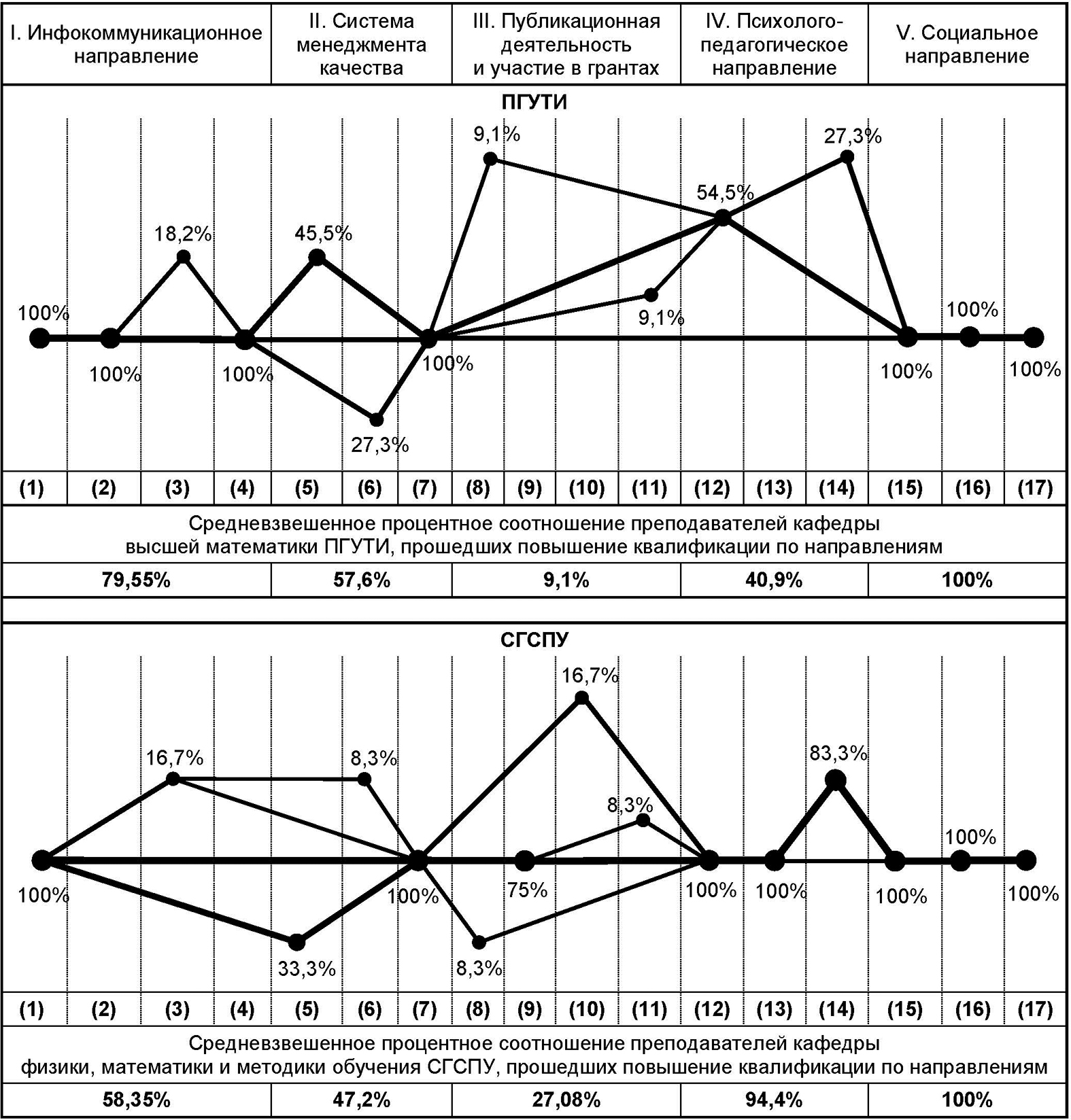 Проведенный анализ показывает, что прохождение повышения квалификации по ряду определенных направлений инициируется и контролируется руководством вузов, что обеспечивает стопроцентный охват преподавательского состава. При этом наличие множественных ответвлений демонстрирует непрерывный учет каждым преподавателем своих актуальных и потенциальных профессиональных возможностей. Анализ средневзвешенного процентного соотношения по направлениям курсов показывает, что преподаватели ПГУТИ более мотивированы на изучение инфокоммуникационных технологий, а преподаватели СГСПУ в большей степени ориентированы на усиление психолого-педагогической компетентности.