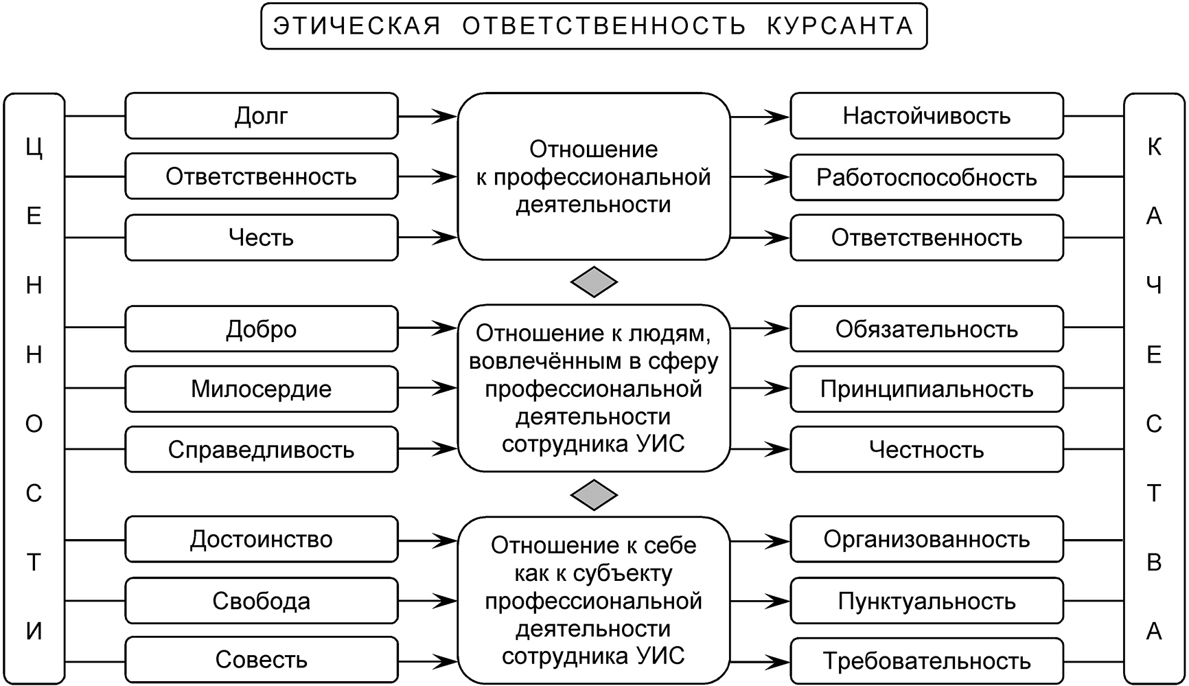 С нашей точки зрения, содержательное наполнение процесса формирования этической ответственности курсантов необходимо раскрывать, основываясь на научных представлениях о профессиональной этике сотрудника УИС, об этическом смысле предъявляемых к нему требований, конкретизируемых в ценностях и личностных качествах, характеризующих этическую ответственность курсантов. В материале учебных дисциплин, внеаудиторной воспитательной работы вычленяются ценности, определяющие отношение курсанта к служебной деятельности, к людям в нее вовлеченным и к самому себе как ее субъекту. В процессе организуемого преподавателем осмысления ценностей происходит их присвоение курсантом. Освоенные ценности, ставшие достоянием ценностной сферы сознания будущего сотрудника УИС, принимают форму мотивов соответствующих отношений обучающихся. Внешнее выражение этих отношений осуществляется через личностные качества курсанта, в соответствии с которыми выстраивается модель его поведения в каждой конкретной ситуации. Приобщение курсантов к ценностям и развитие качеств идет на лекционных и семинарских занятиях по учебным дисциплинам, в процессе внеаудиторной воспитательной работы, а их реализация осуществляется в процессе производственной практики.