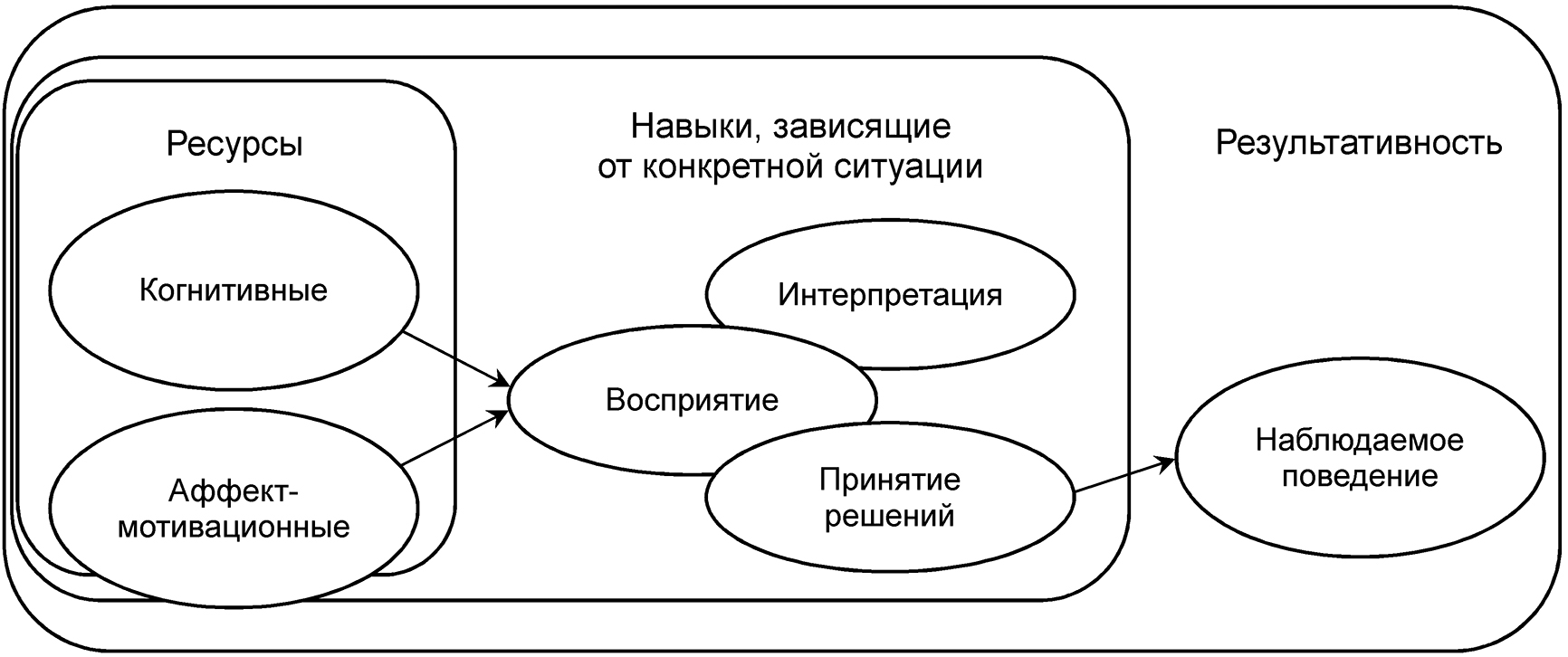 Модель, представленная на рисунке 1, рассматривает универсальную компетенцию как некий континуум и представляет попытку объединить аналитический и холистический/поведенческий подходы. Аналитическая часть модели (левая часть рисунка) включает показатели когнитивных, аффективных и мотивационных черт/ресурсов, востребованных в определенных контекстах/ситуациях. Все они структурно связаны с результативностью работы в реальной профессиональной или жизненной ситуации (правая часть рисунка) посредством некоторого набора универсальных компетенций или их аспектов, в данном случае – восприятия, интерпретации, принятия решений (средняя часть рисунка).
