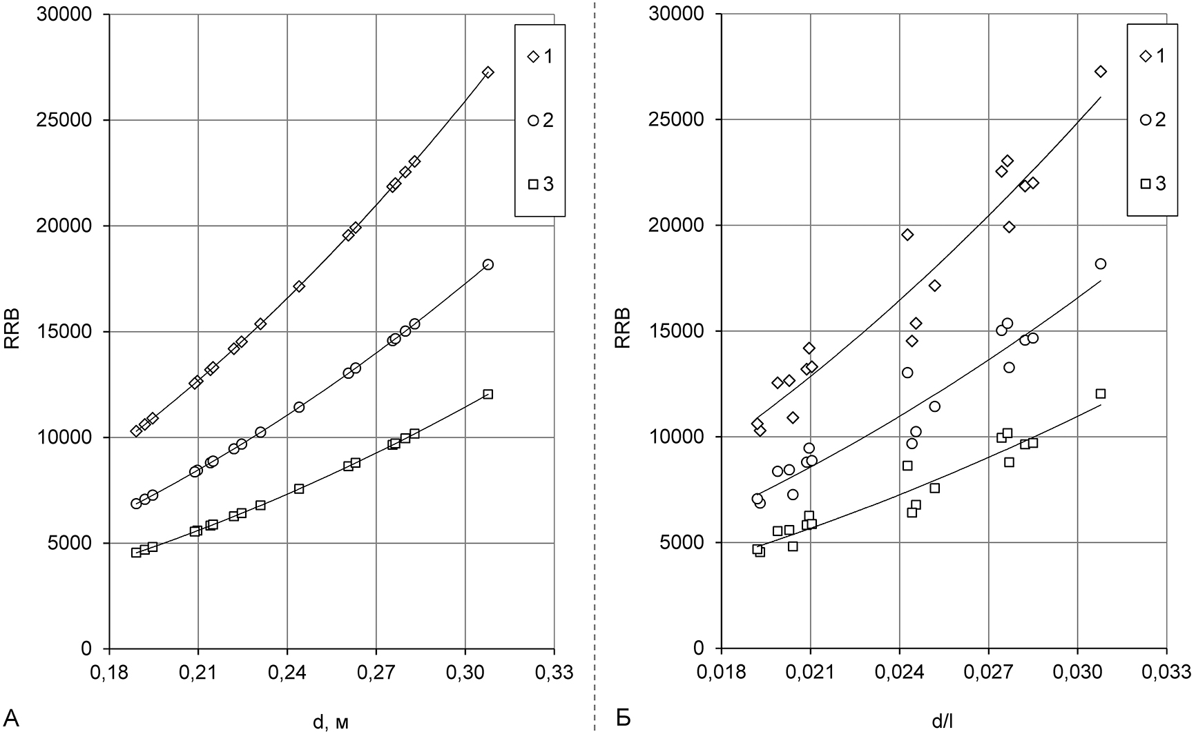 Рисунок 3 – Зависимость относительного сопротивления изгибу RRB от диаметра ствола (А) и отношения диаметра к длине ствола (Б)