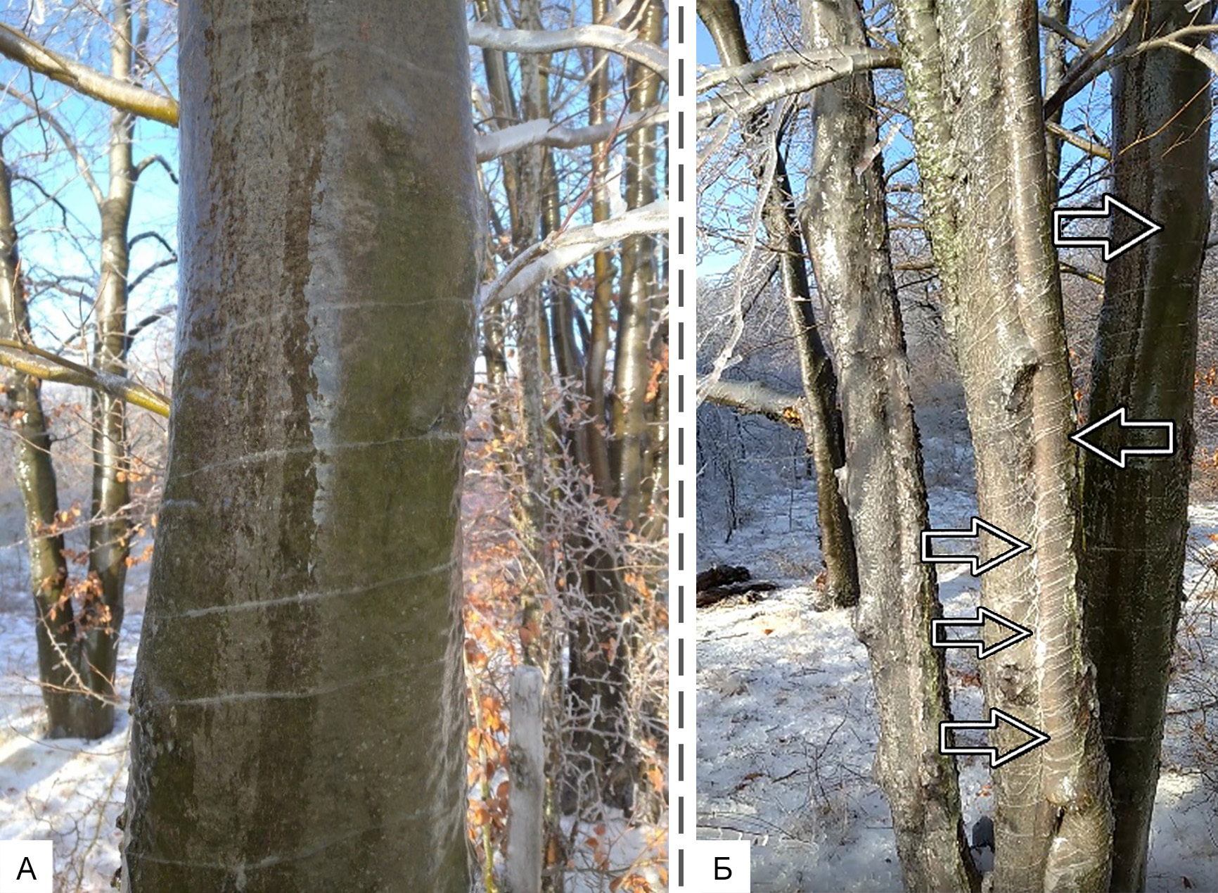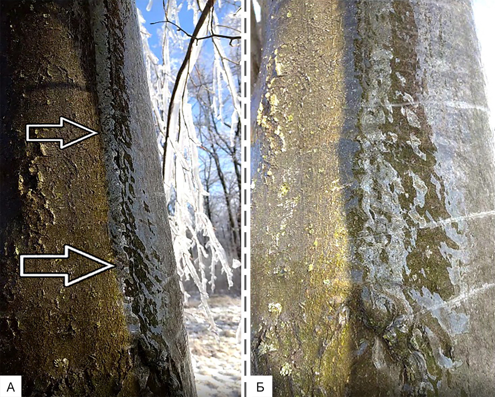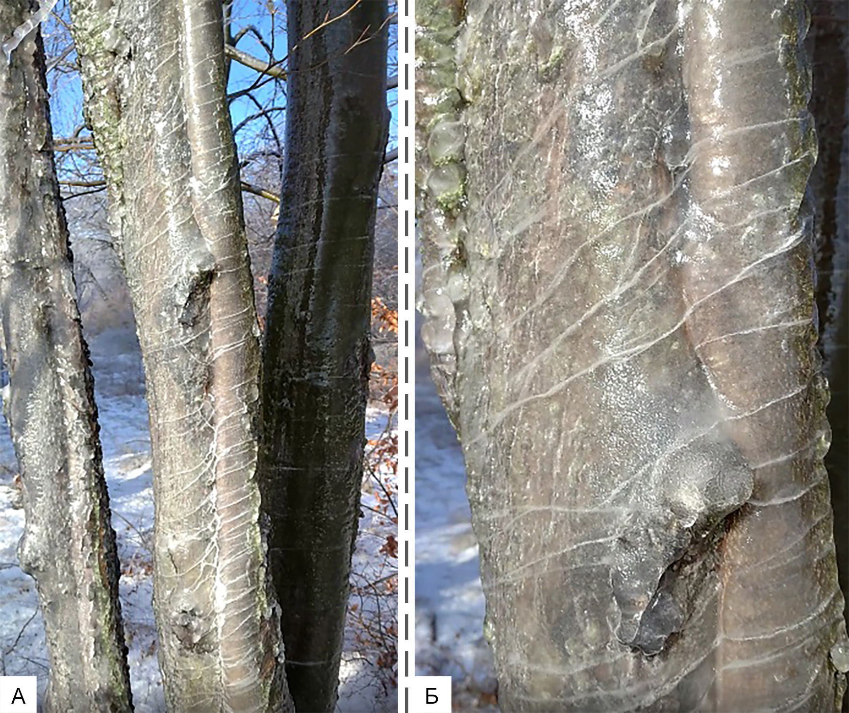 Примечания: А – множественные сколы ледяной корки на стволах бука европейского при действии нагрузки с различных сторон и приводящие к сдвигам; Б – крупный план трещин ледяной корки.