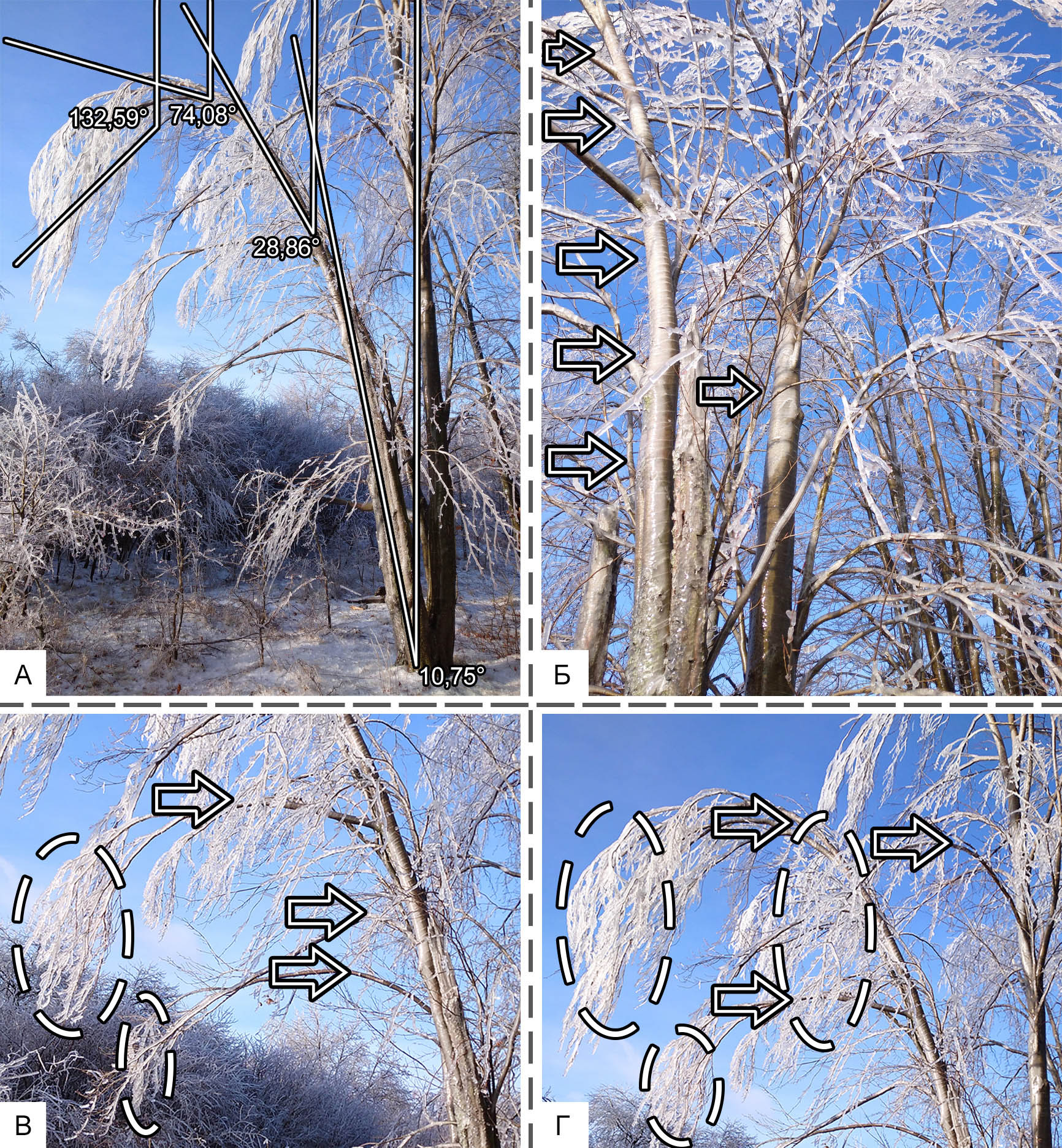 Примечания: А – выделены критические углы наклона ствола и скелетных ветвей; на рисунках Б–Г круговыми областями выделена оледеневшая и нерастаявшая часть на скелетных ветвях, которая, действуя как собственная масса, приводит к деформации; стрелками указана область прогрева, которая имеет другие физико-механические свойства по сравнению с оледеневшей частью ветви.