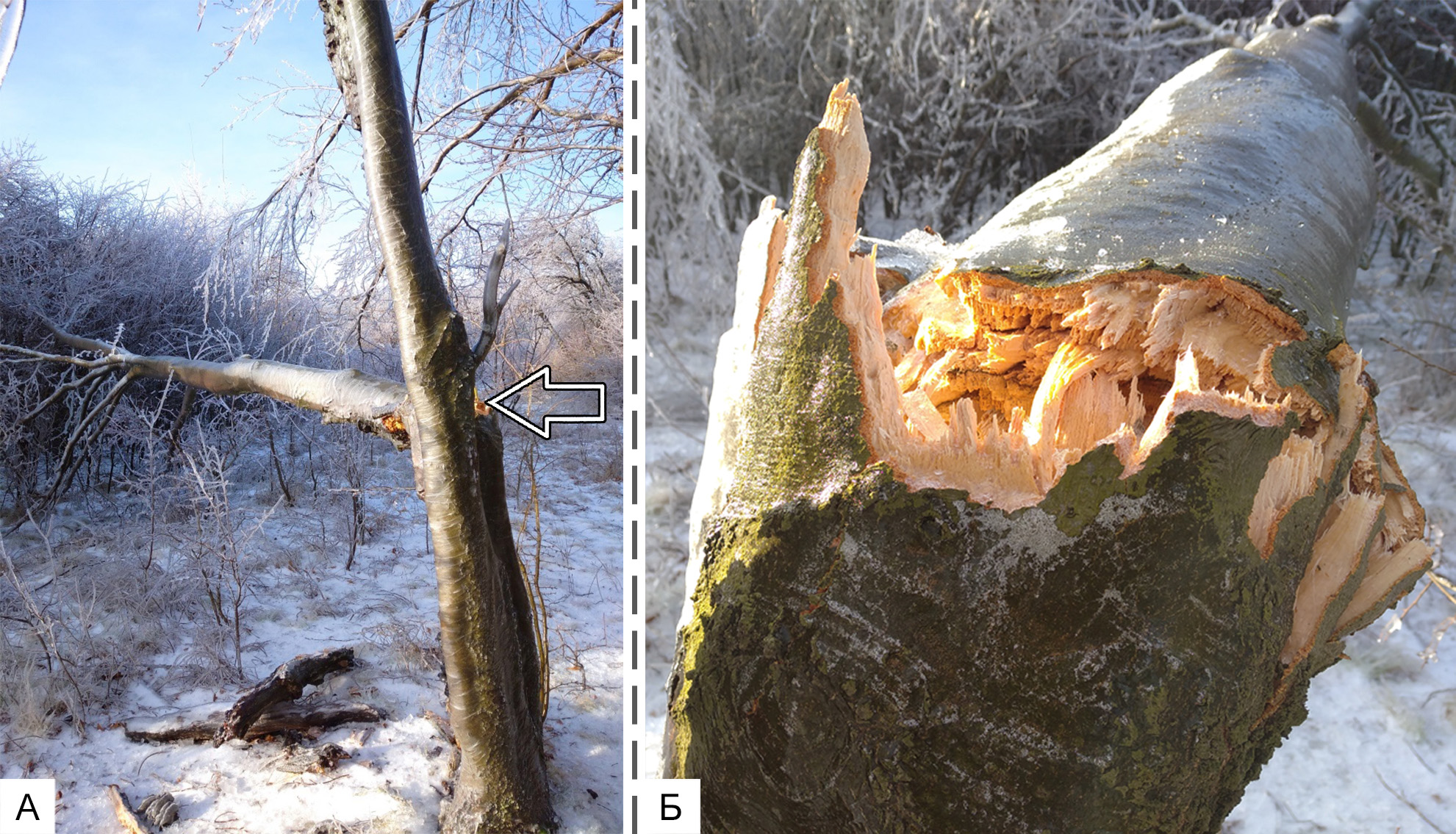 Примечания: А – стрелкой указана область прогрева ствола, которая имеет другие физико-механические свойства по сравнению с оледеневшей её частью; Б – место облома ствола, при этом верхняя часть остается оледеневшей после падения и четко фиксируется как дополнительная масса, о чем упоминалось выше по тексту.