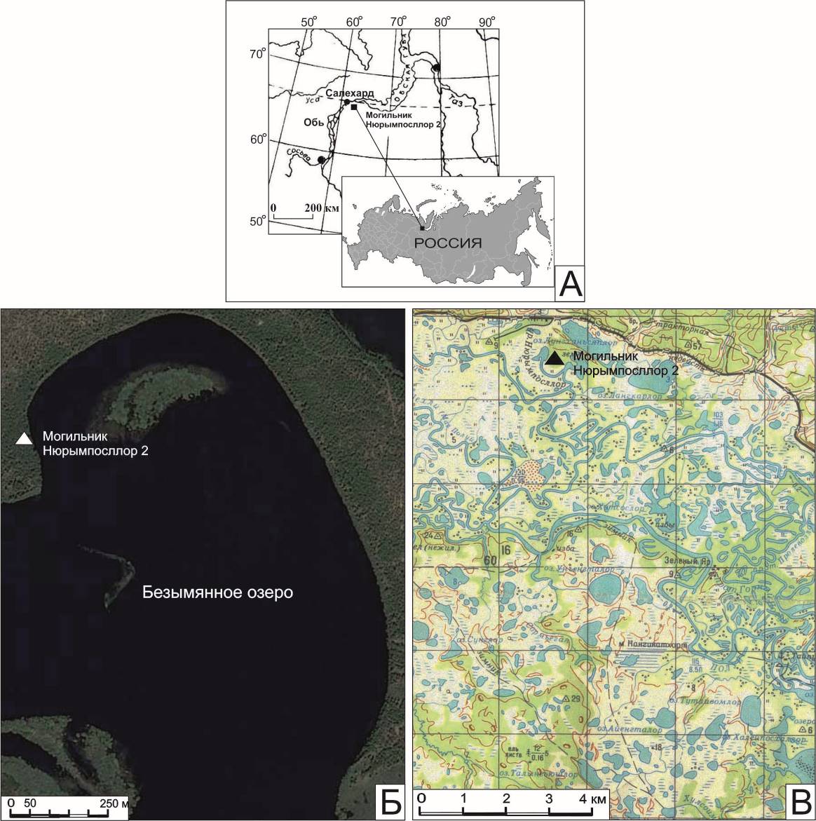 Рисунок 1 – Могильник Нюрымпосллор 2. А – карта Ямало-Ненецкого автономного округа с месторасположением памятника; Б – космоснимок территории памятника; В – карта Приуральского района Ямало-Ненецкого автономного округа с месторасположением памятника