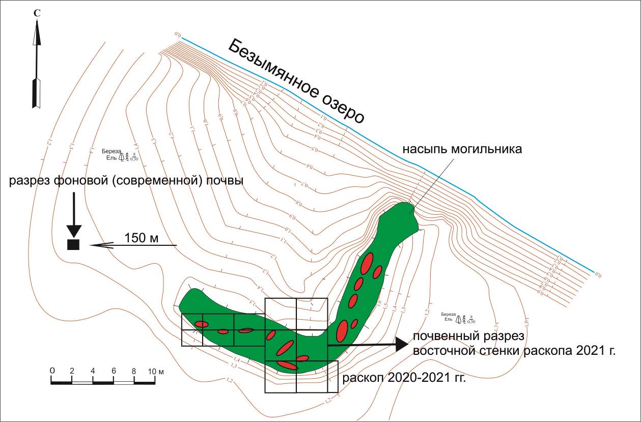 Морфологическое строение зачистки 1–21 свидетельствует о том, что насыпь, возникшая на мысу около 500 лет назад (исходя из возраста самых древних захоронений могильника), перекрыла подзолистую почву (сейчас это погребенная почва 1), верхние горизонты которой А0 и А1 в процессе погребения трансформировались в единый уплотненный горизонт [А0А1]'.