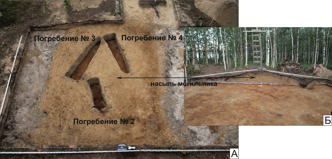 В ходе двухлетних раскопок (2020–2021 гг.), проведенных экспедицией Научного центра изучения Арктики под руководством Ал.В. Гусева, было исследовано 7 грунтовых захоронений разной степени сохранности. Из них 3 погребения принадлежали мужчинам, а 4 погребения – детям.