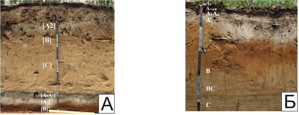 [B]'' – мощность 15–13 см, серо-бурый, относительно плотный, бесструктурный, песчаный;