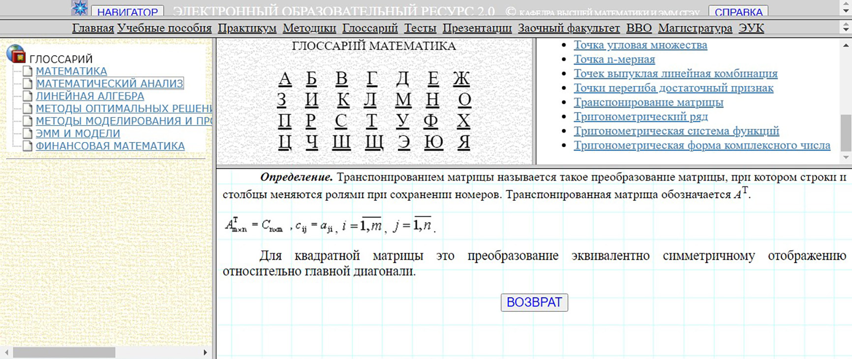Рисунок 1 – Представление глоссария дисциплины «Математика»