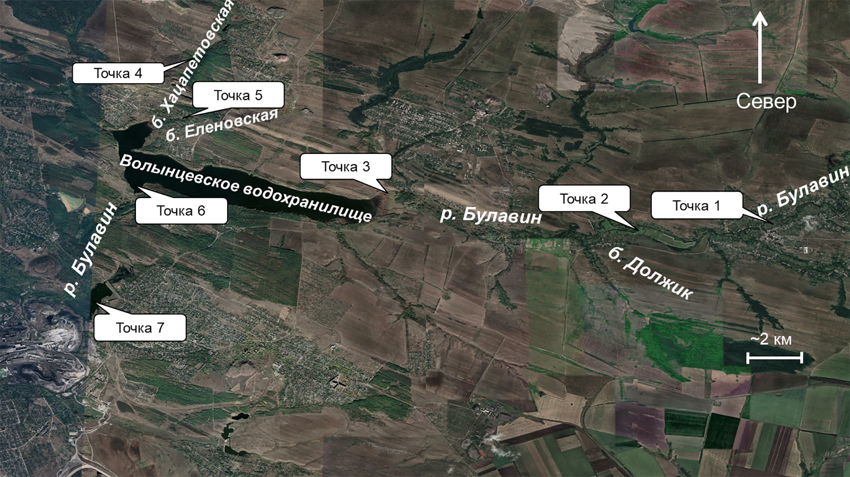 Оценку токсичности поверхностных вод исследуемого водохранилища производили с учетом всех крупных притоков, включая основной – р. Булавин (рис. 1). Точки отбора проб располагались на русле реки Булавин до впадения в водохранилище (точки 1 и 3) и после него (точка 7). К числу притоков Волынцевского водохранилища относятся балки Хацапетовская и Еленовская (точки 4 и 5 соответственно), а также балка Должик, впадающая в реку Булавин непосредственно перед вхождением в водохранилище (точка 2).