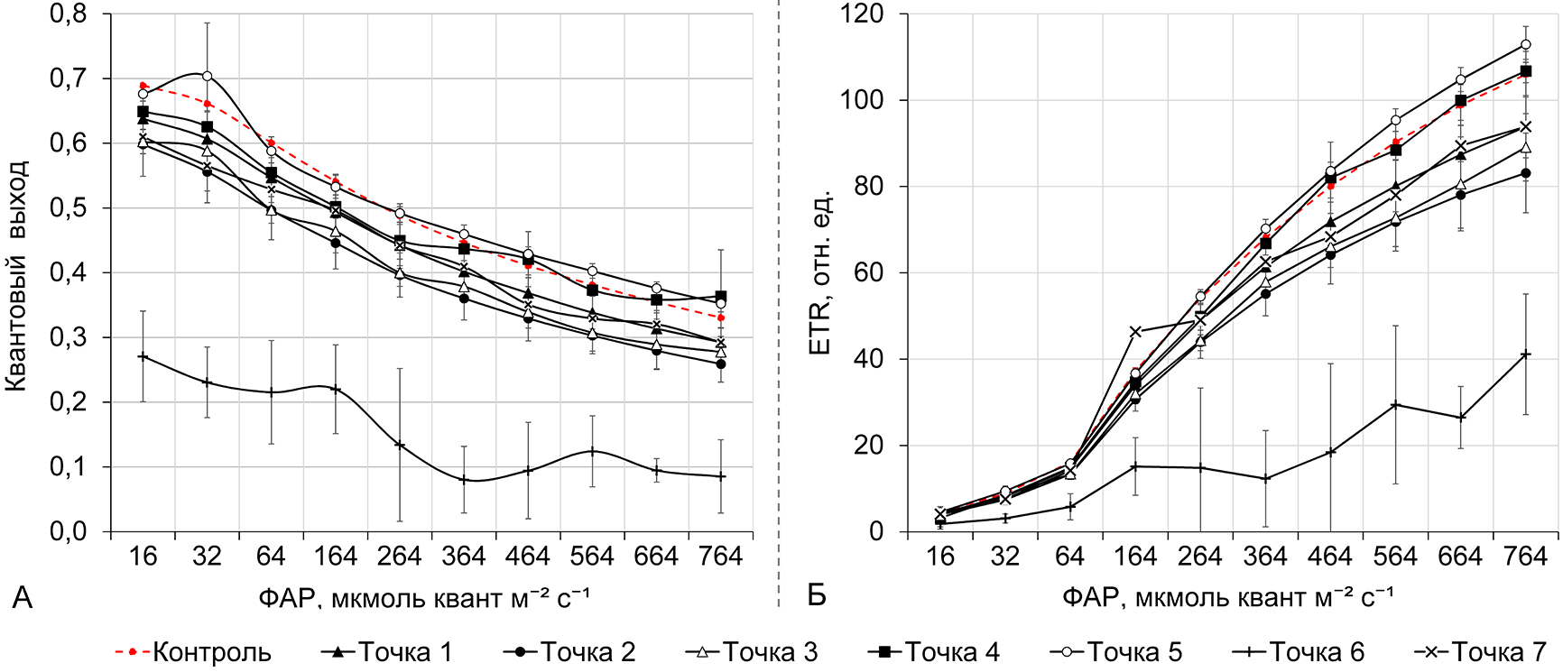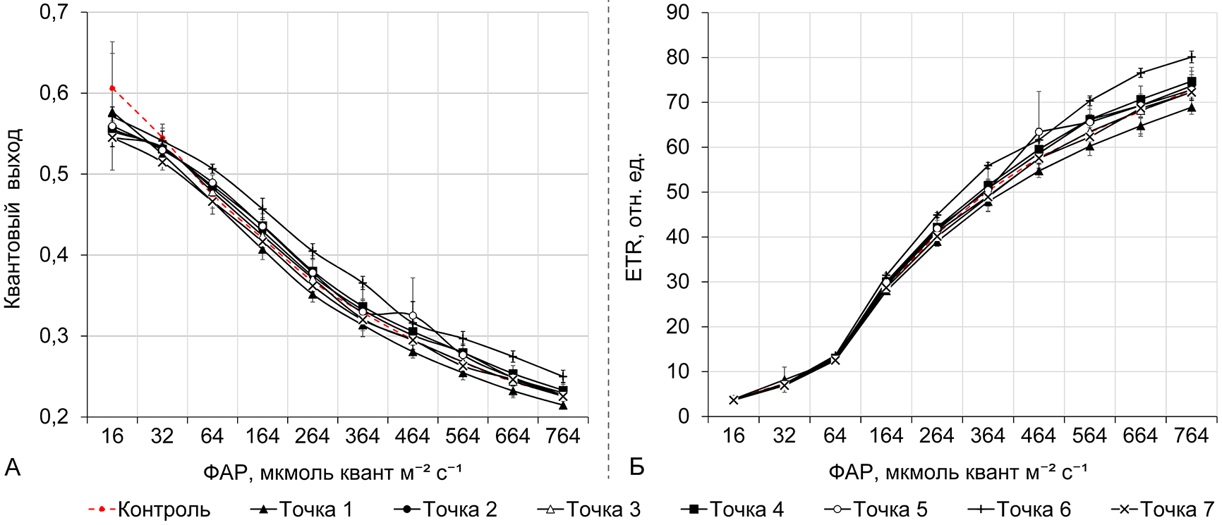 Рисунок 2 – Световые кривые квантового выхода флуоресценции хлорофилла a (А) и скорости электронного транспорта – ETR (Б) после 24 часов экспозиции