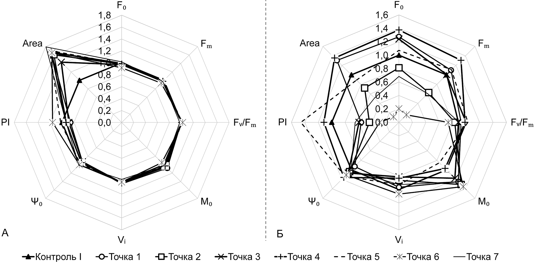Параметры, отражающие эффективность функционирования фотосинтетического аппарата (Fᵥ/Fₘ, PI), на данном этапе исследования были неинформативны (рис. 4: А). Достоверные отличия индекса PI от контроля были получены только для мониторинговой точки 6.
