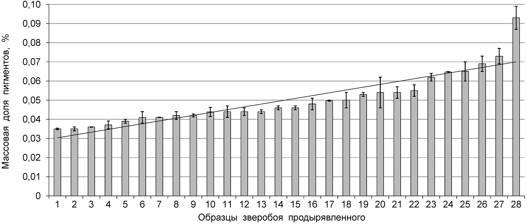 2. Figure 1 – Distribution of the amount of naphthodiantrone pigments in the aboveground phytomass of St. John's wort of different geographical origin according to spectrophotometric analysis, 2023 Vertically: mass fraction of pigments, %. Horizontally: St. John's wort samples: 1 – Omsk, 2 reproduction; 2 – Saratov, 4 reproduction; 3 – Altai Mountains, 4 reproduction; 4 – Oslo 221, 2 reproduction; 5 – Barnaul, 4 reproduction; 6 – Leipzig 379, 2 reproduction; 7 – Syktyvkar, 5 reproduction; 8 – Makhachkala, 2 reproduction; 9 – Tallinn 749, 2 reproduction; 10 – Oslo 222, reproduction; 11 – S. Solnechny, 2 reproductions; 12 – Novosibirsk, 4 reproductions; 13 – Riga, 2 reproductions; 14 – Leipzig 898, 2 reproductions; 15 – Zolotodolinsky village, 4 reproductions; 16 – Kirov region, 4 reproductions; 17 – Leipzig 319, 2 reproductions; 18 – Petrozavodsk, 2 reproductions; 19 – Samara, 1 reproduction; 20 – Yoshkar-Ola, 2 reproduction; 21 – Novosibirsk, 2 reproduction; 22 – London, 2 reproduction; 23 – Irkutsk region, 4 reproduction; 24 – Tallinn 887, 2 reproduction; 25 – Kazan, 2 reproduction; 26 – Oslo 219, 2 reproduction; 27 – Tallinn 888, 2 reproductions; 28 – Tallinn 885, 2 reproductions