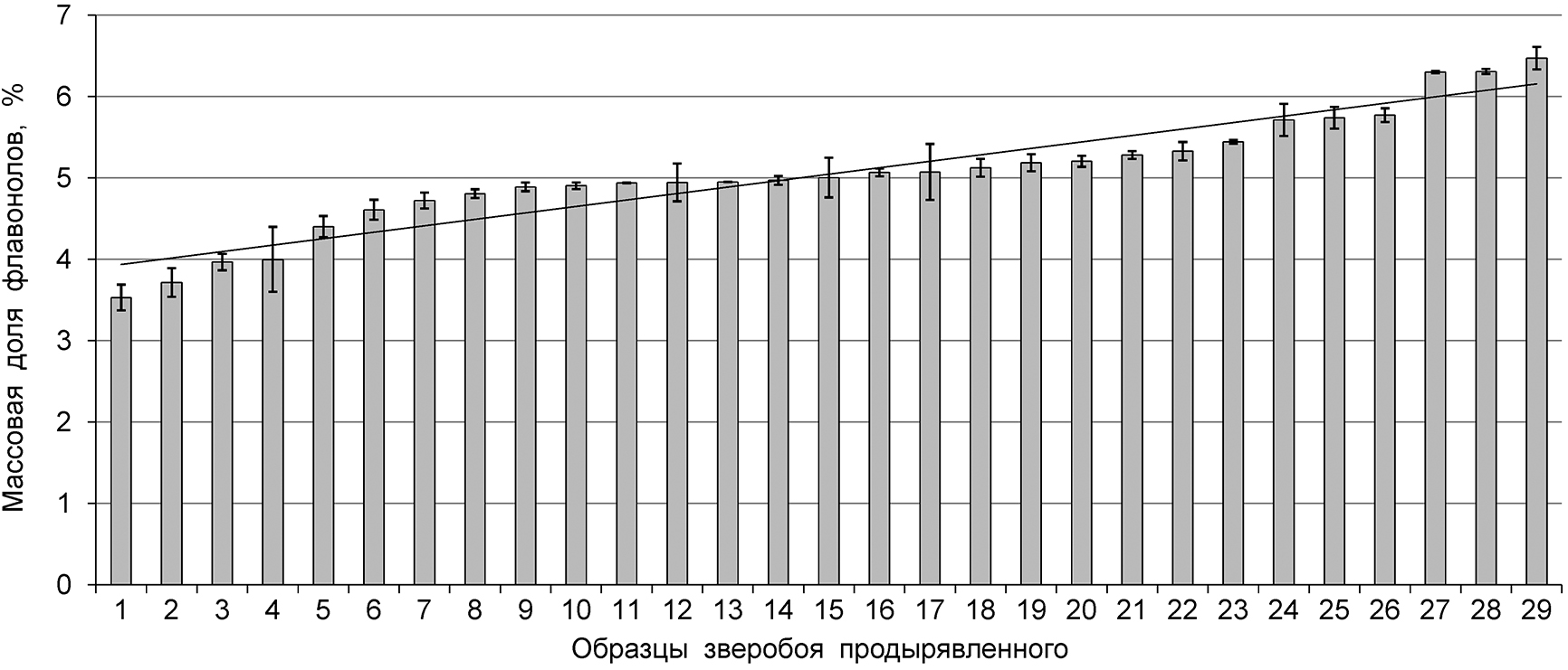 Массовая доля флавонолов в лекарственном сырье зверобоя, отобранного для анализа в 2023 г., находилась в интервале 3,52–6,82% и являлась более консервативной характеристикой для растений, выращиваемых в одинаковых агроклиматических условиях. В выборке из 29 образцов растений среднее значение массовой доли флавонолов составляло 4,8–5,8% (рис. 2). Минимальным содержанием флавонолов (менее 4%) характеризовались два образца зверобоя продырявленного (Саратов и Омск) из двадцати девяти. Высоким содержанием флавонолов (более 5,8%) характеризовались четыре образца зверобоя: Таллин 885, 887, 888 и Казань (рис. 2). Все без исключения образцы зверобоя продырявленного по содержанию флавонолов удовлетворяют требованиям ФС. 2.5.0015.15 Государственной Фармакопеи РФ (сумма флавоноидов в пересчете на рутин не менее 1,5%) [20, с. 6081].