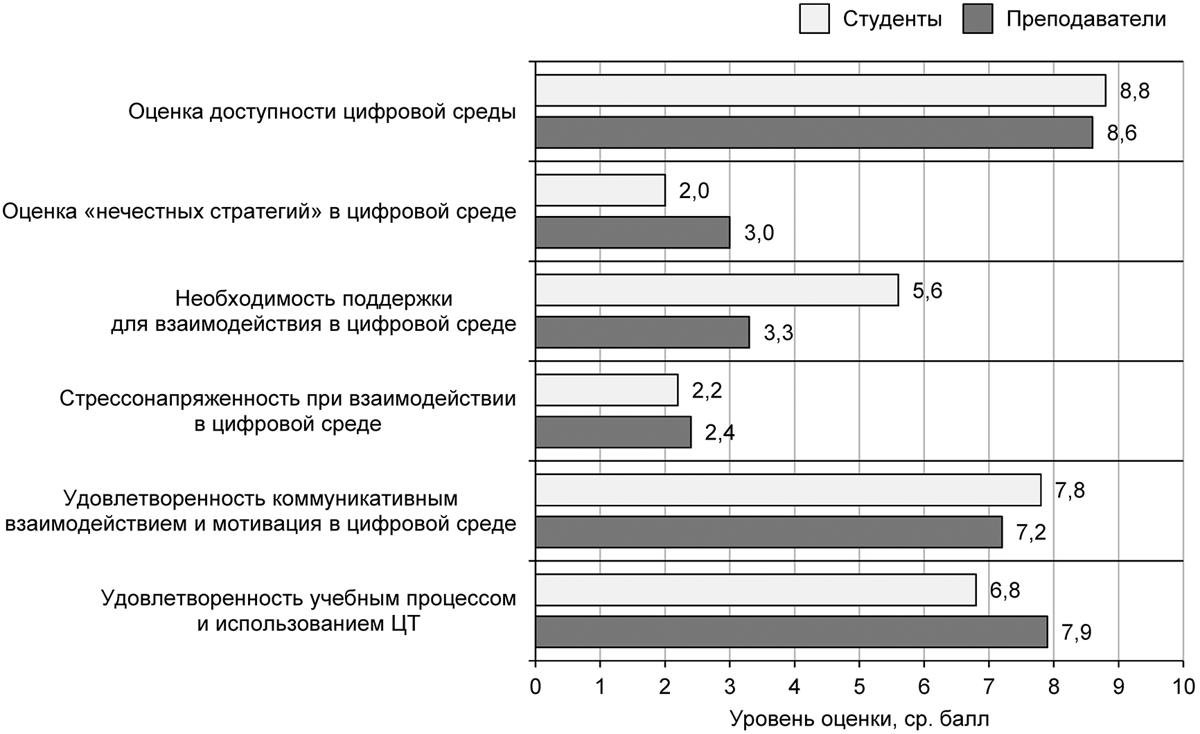 Профили оценок студентов и преподавателей достаточно высокие (входят в диапазон выше среднего уровня) и практически идентичны друг другу по многим параметрам. Статистически достоверные различия между группами были выявлены только по показателям субъективного ощущения необходимости поддержки для педагогического взаимодействия в цифровой образовательной среде (p < 0,01), причем, такие показатели выше в группе преподавателей, чем студентов, что может быть объяснено сниженной общей цифровой грамотностью преподавателей, имеющих стаж научно-педагогической деятельности свыше 10 лет. В целом же, по результатам мониторингового исследования, большинство субъектов образовательного процесса в вузе вполне удовлетворены внедрением информационно-коммуникационных технологий и разработанных электронных ресурсов в образовательную среду.