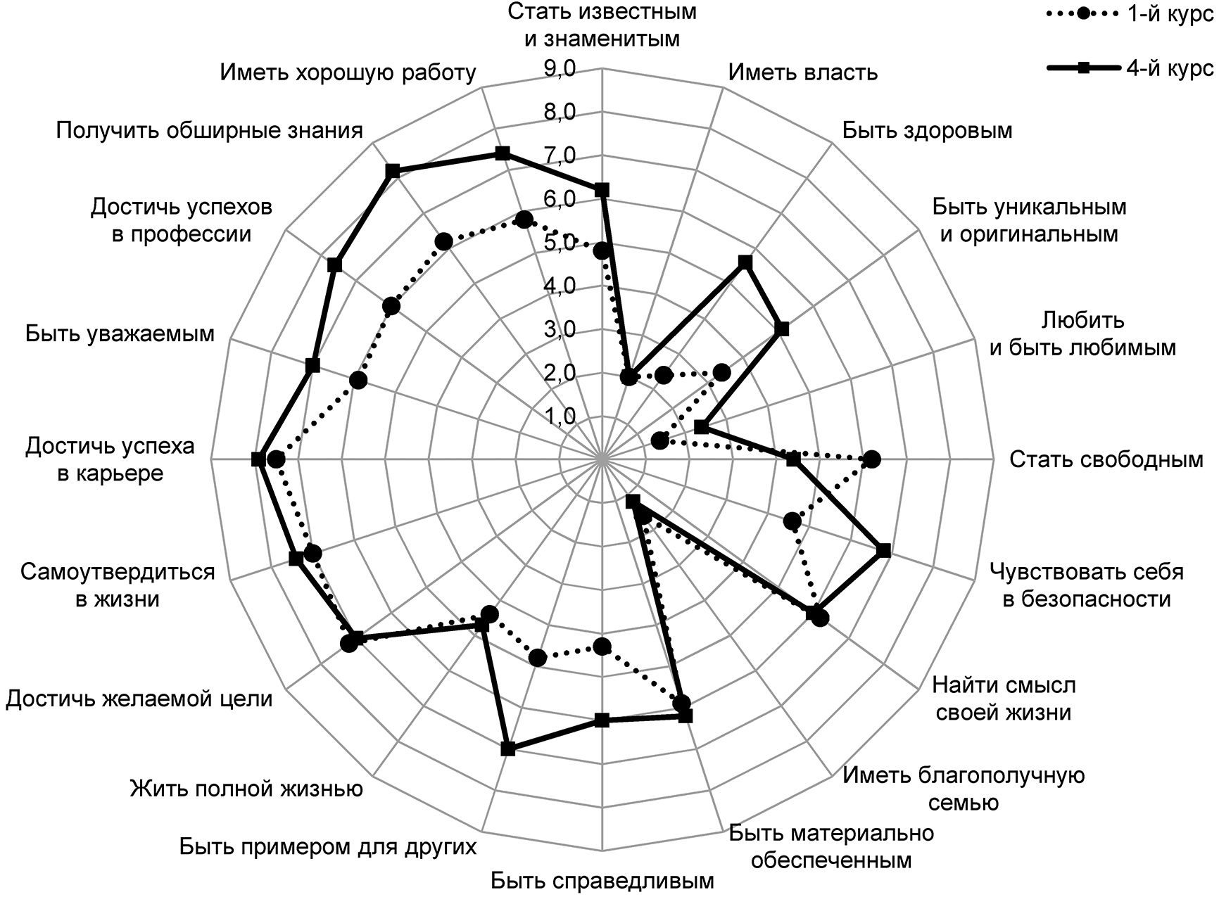 Следует указать и на тот факт, что первокурсники, в отличие от студентов выпускных курсов, не связывают образовательную среду вуза с ее возможностями обеспечить их здоровье (2,4 балла, что соответствует низкому уровню восприятия), стремление стать уникальным и оригинальным (3,4), получить хорошие и качественные знания (3,2). Данные показатели значимо выше в группе старшекурсников (различия на уровне <0,001), что дает основание говорить о росте уверенности студентов в надежности образовательной среды университета, обеспечивающей возможность удовлетворения потребностей найти хорошую работу (t = 3,54, p < 0,001), стать примером для других (t = 3,22, p < 0,01), быть уважаемым человеком (t = 3,39, p < 0,01). Значимо различаются в двух группах и показатели восприятия образовательной среды вуза как гаранта чувства защищенности и безопасности (t = 4,18, p < 0,001), что свидетельствует о ее безопасности и обеспечении психологического благополучия обучающихся.