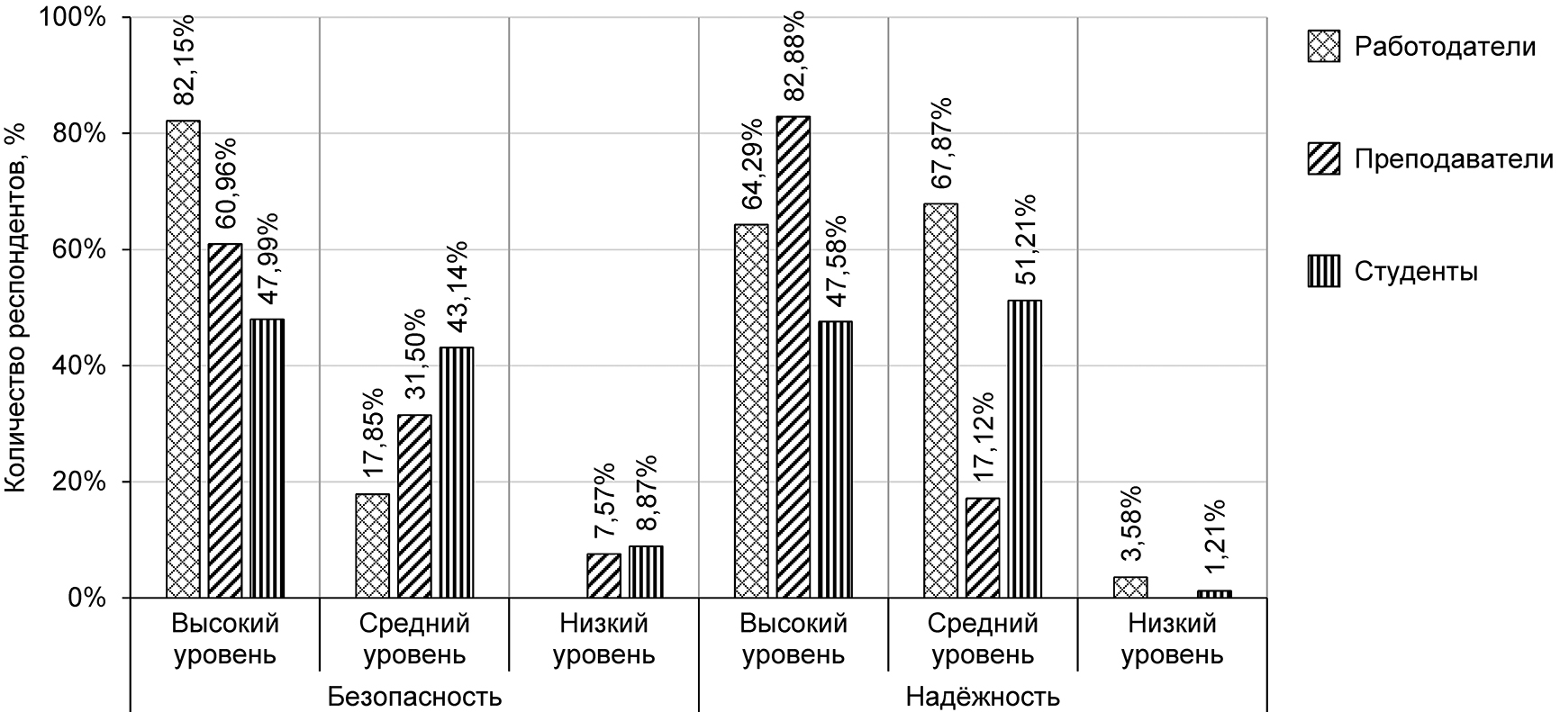 Большинство представителей крупных организаций Краснодарского края дали высокую оценку безопасности (82,15%) и надежности (62,29%) образовательной среды вуза. Но, если в данной группе безопасность оценена была выше, то в группе научно-педагогических работников, напротив, высоко оценена надежность образовательной среды вуза. Более 80% преподавателей склонны считать, что образовательная среда вуза характеризуется надежностью и качеством образования, что нововведения, которые внедряются в нее, обладают надежными характеристиками и служат для повышения эффективности учебно-образовательного процесса.