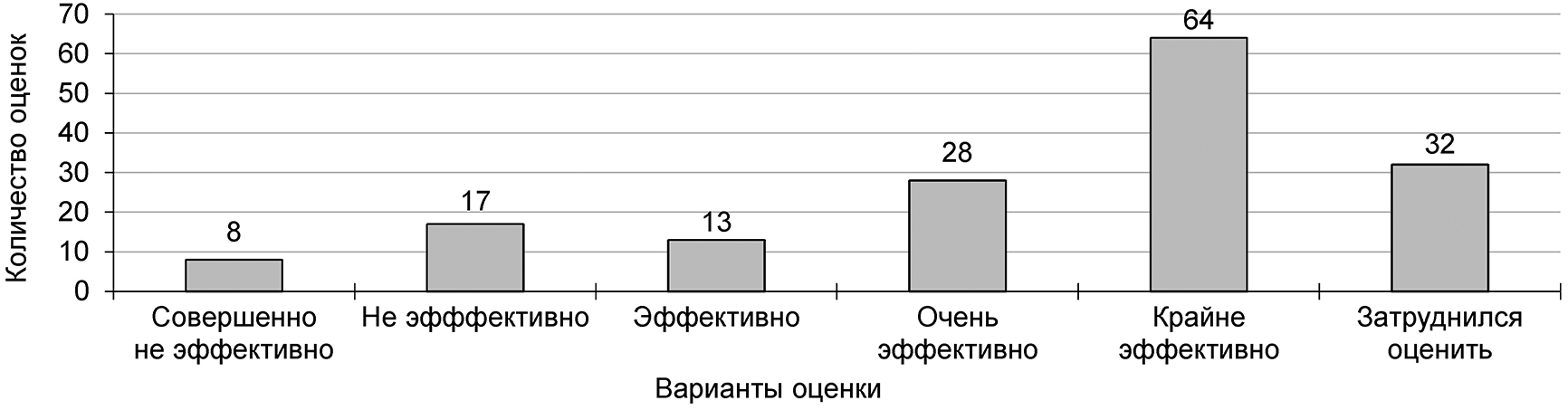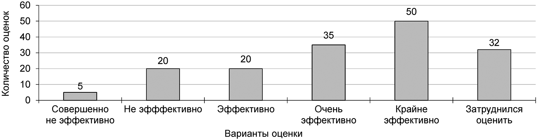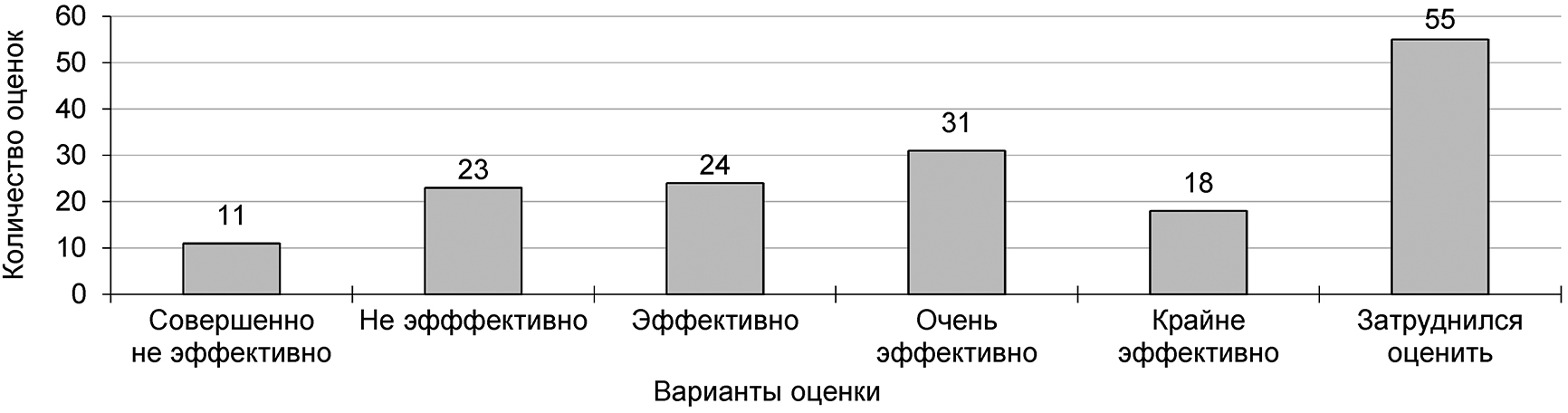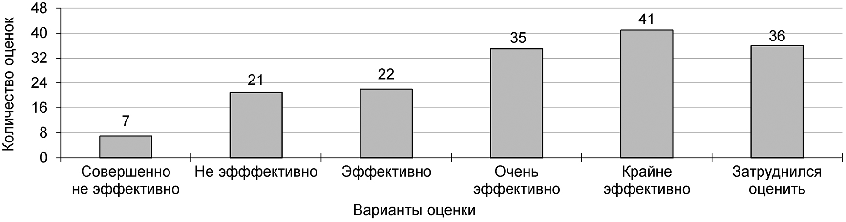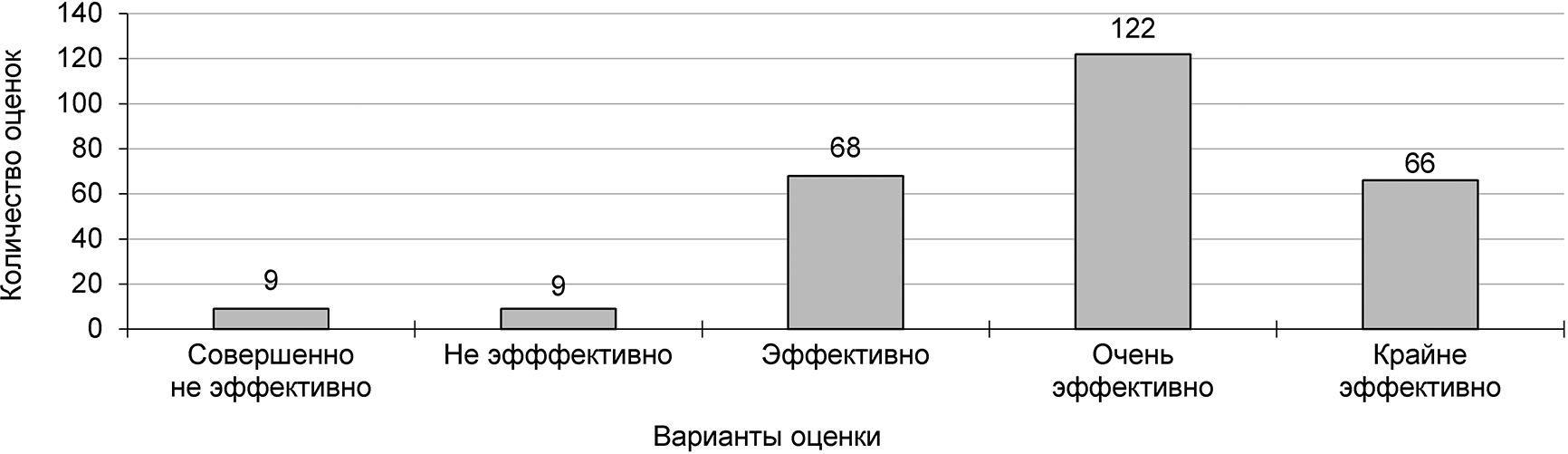 Согласно результатам опроса (рис. 1, 2, 3, 4) педагоги оценивают «крайне эффективно» потенциальное увеличение объема практической подготовки студентов – 40% опрошенных, потенциальное повышение фундаментальной подготовки студентов – 31% и потенциальное развитие сетевых образовательных программ – 25%. Менее значительным оценивается потенциальный эффект от внедрения новых форм государственной итоговой аттестации. При этом около 24% педагогов испытывали затруднение при ответе на вопрос 1. Возможная причина этих затруднений была связана с недостаточной информированностью на дату опроса о новой модели образования.