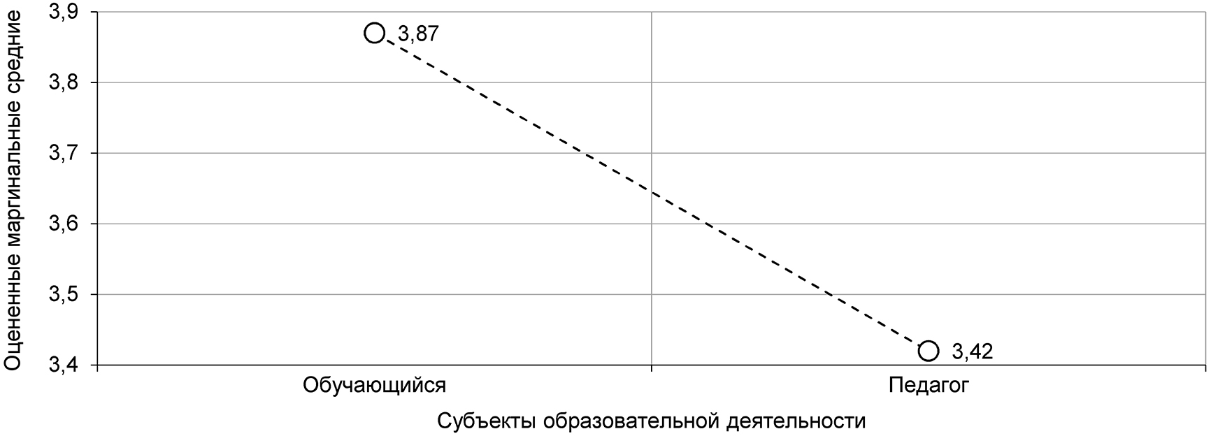 Представленные на рис. 5 и рис. 6 оценки проанализированы с помощью программы «IBM SPSS Statistics 23», которая сгенерировала данные по результатам однофакторного дисперсионного анализа с зависимой переменной «оценка потенциальной эффективности получения нескольких квалификаций» и с независимой переменной «профессия» с градацией «педагог» и «обучающийся». Согласно профилю (см. рис. 7), оценка эффективности возможного получения студентами нескольких квалификаций при освоении программ базового высшего образования по результатам анализа выше у обучающихся (3,87 балла – «очень эффективно»), чем у педагогов (3,42 балла – «эффективно») на высоком уровне статистической значимости (F-критерий = 20,458; значимость p ≤ 0,001). Более высокая оценка обучающимися обусловлена их понятным стремлением освоить больше квалификаций и более высокой мотивацией.