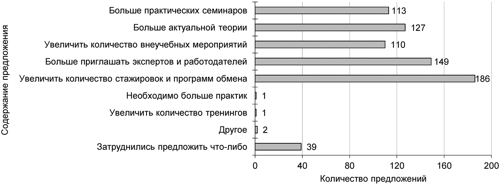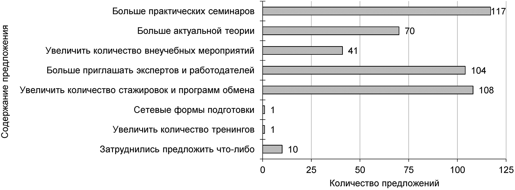 Согласно проведенному анализу, большинство опрошенных предлагают увеличить количество стажировок, чаще привлекать для занятий экспертов и работодателей, (что, в частности, позволит осваивать актуальную теорию), проводить больше практических занятий и внеучебных мероприятий (рис. 8, 9).
