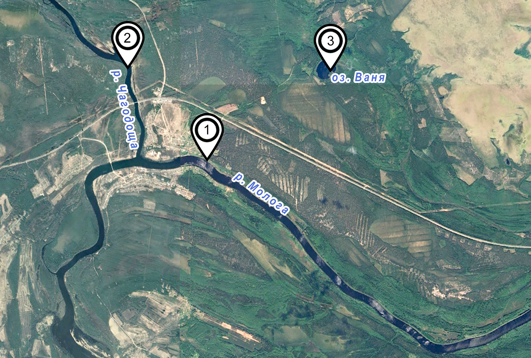 2. Figure 1 – Map-scheme of the study area indicating the location of fishing spots (highlighted with numbers) where fish were caught: 1 – Mologa River; 2 – Chagodoshcha River; 3 – Lake Vanya