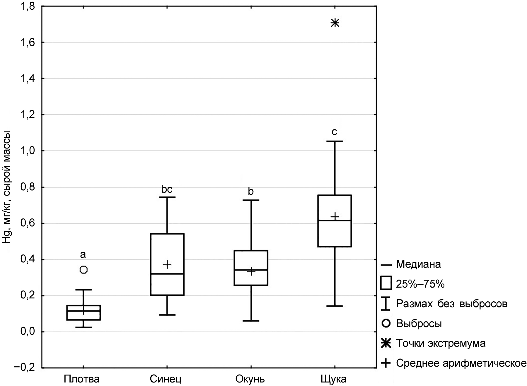 Ранее установлено, что миграция ртути по трофической сети сопровождается 5–10-кратным увеличением ее концентрации при переходе от одного звена к следующему [2; 17]. Чем «выше» расположен организм в трофической цепи, тем выше в нем содержание ртути [7]. Таким образом, содержание ртути у хищных рыб может превышать содержание ртути в воде обитания рыб в сотни тысяч и даже миллионы раз [7; 18; 19].