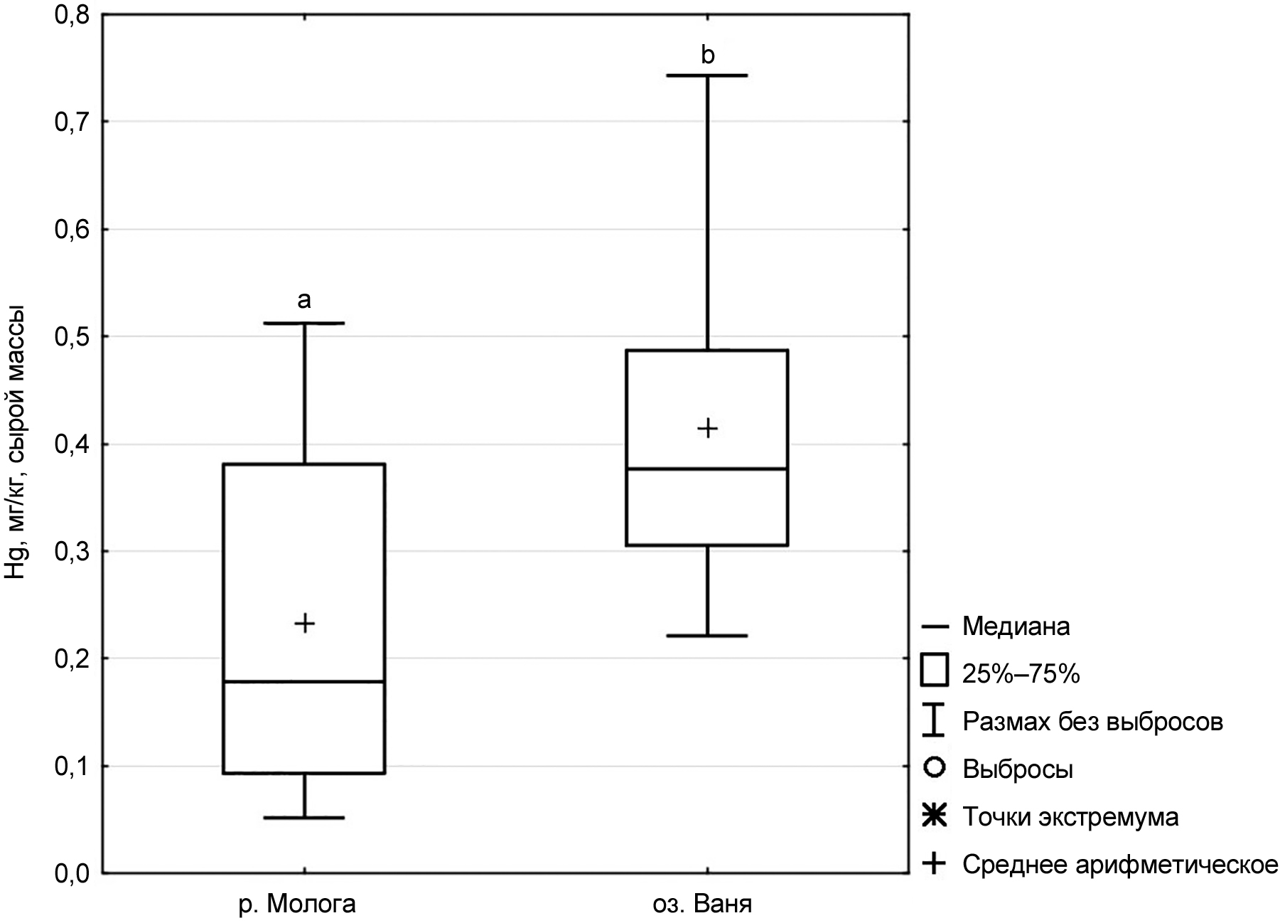 Содержание ртути в мышцах окуней, отловленных в озере, статистически значимо выше (в среднем в 2 раза), чем у особей, отловленных в реке на исследуемой территории (рис. 3). Исходя из литературных данных характер накопления Hg, по всей видимости, связан с особенностями конкретных условий обитания (прежде всего pH воды донных отложений, количество растворенной органики) [4].