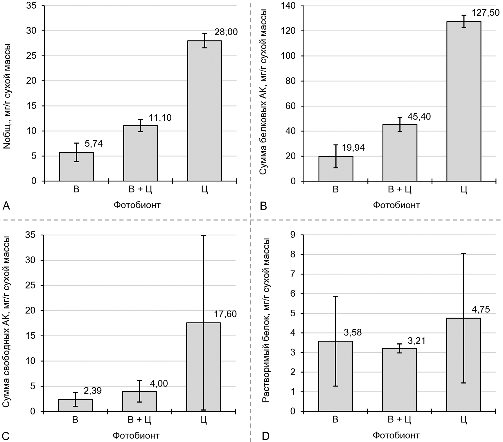 Рисунок 1 – Содержание общего азота (A), суммы белковых аминокислот (B), суммы свободных аминокислот (C) и растворимого белка (D) в талломах лишайников с разным типом фотобионта: В – водоросли, В + Ц – водоросли и цианобактерии, Ц – цианобактерии