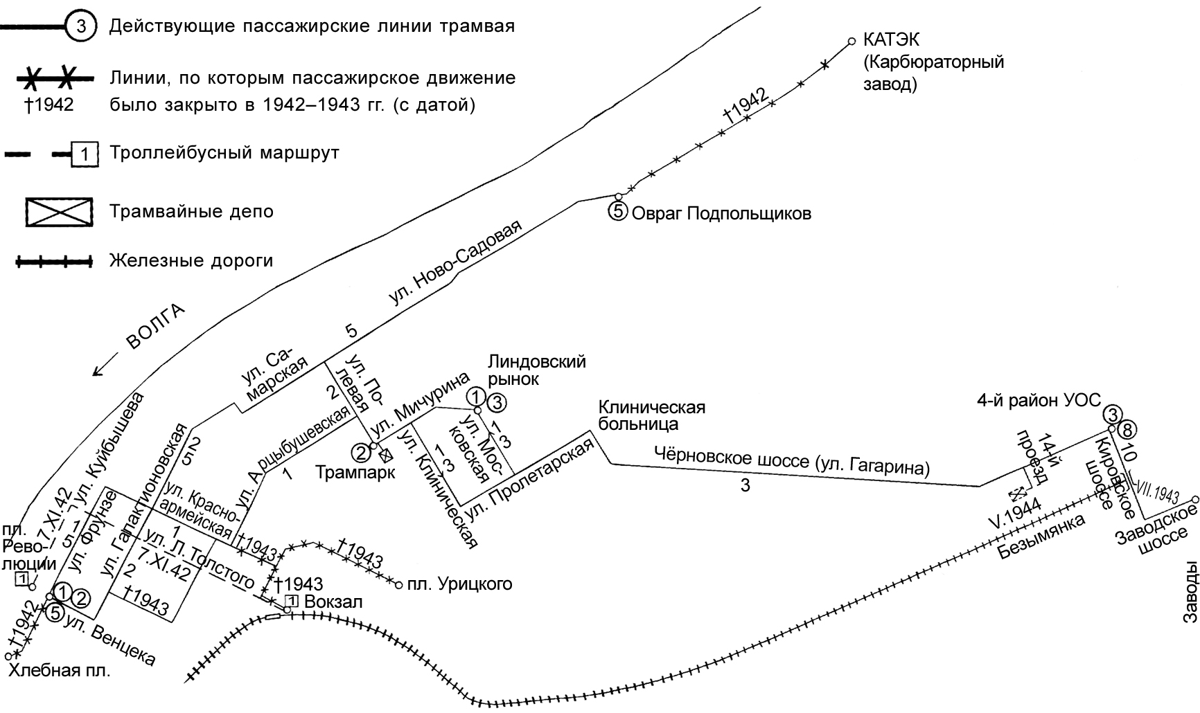 Рисунок 1 – Линии куйбышевского трамвая и троллейбуса к концу 1943 г. [12, с. 51]