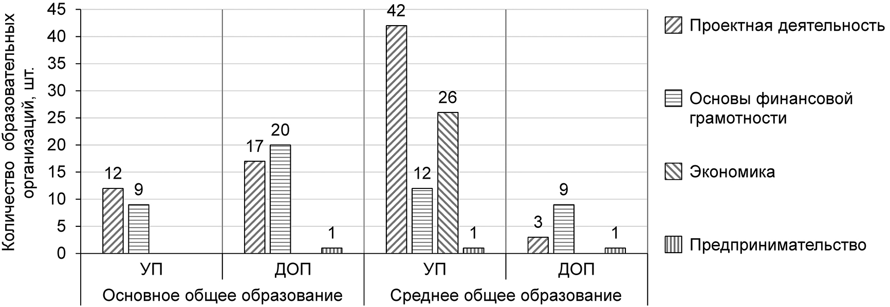Анализ экономических учебных предметов в школах г. Томска (рис. 1) позволил сделать вывод, что в среднем общем образовании (СОО) уделяется значительно больше внимания экономическим дисциплинам, в частности проектной деятельности и экономике. Но стоит подчеркнуть, что на данных предметах изучаются теоретические компоненты в большей степени для понимания экономической системы и финансовой системы, но не изучается именно предпринимательство. В основной общей школе ученикам предлагается самостоятельно выбирать программу дополнительного образования. Экономика отсутствует, предлагается только финансовая грамотность.