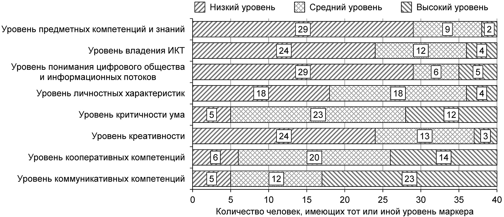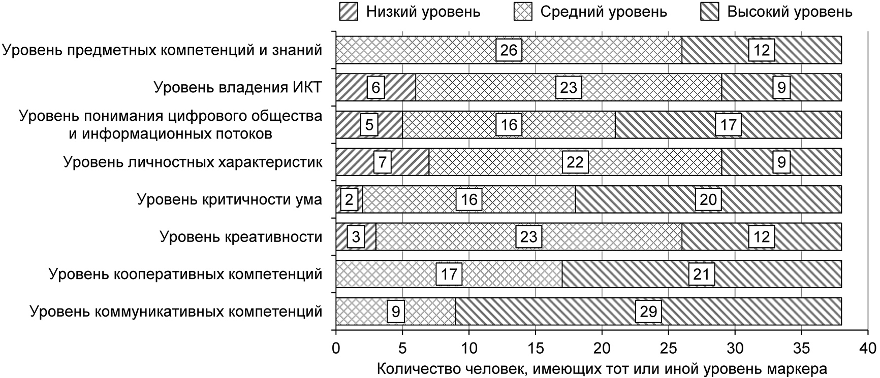 Результаты исследования показали значительное улучшение всех показателей предпринимательского мышления (рис. 3). Однако низкий уровень обучающихся остался по таким маркерам, как личностные характеристики, понимание цифрового общества и информационных потоков, владение ИКТ, креативность и критичность ума. Данный результат можно обосновать непродолжительностью работы с обучающимися, а также отсутствием занятий по предмету «Обществознание» в компьютерном классе, что организовать сложнее, обеспечив каждую группу компьютером как минимум, а как максимум – каждого обучающегося.
