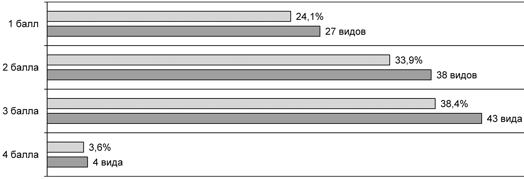 Для определения категории инвазионного статуса видов использовалась ставшая традиционной методика с выделением 4-х статусов [21]: статус 1 – виды – трансформеры, которые активно внедряются в природные сообщества, формируют крупные заросли, успешно конкурируют и вытесняют аборигенные виды, нарушают сукцессионные связи, изменяя структуру и функционирование экосистем; статус 2 – виды, активно расселяющиеся и натурализующиеся в нарушенных, полуестественных и естественных местообитаниях; статус 3 – виды, расселяющиеся и натурализующиеся в нарушенных местообитаниях; статус 4 – потенциально инвазионные виды.