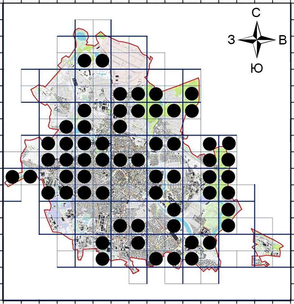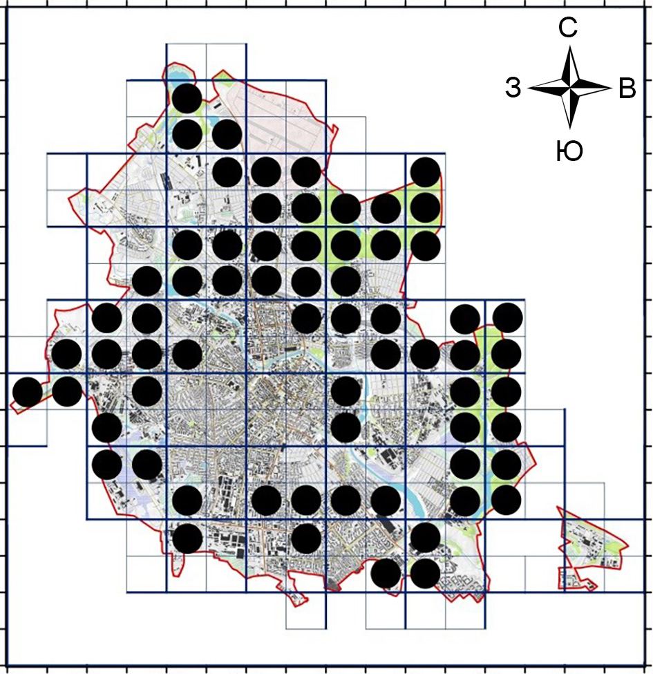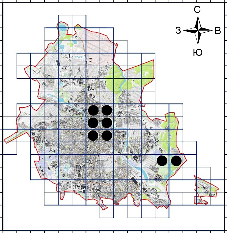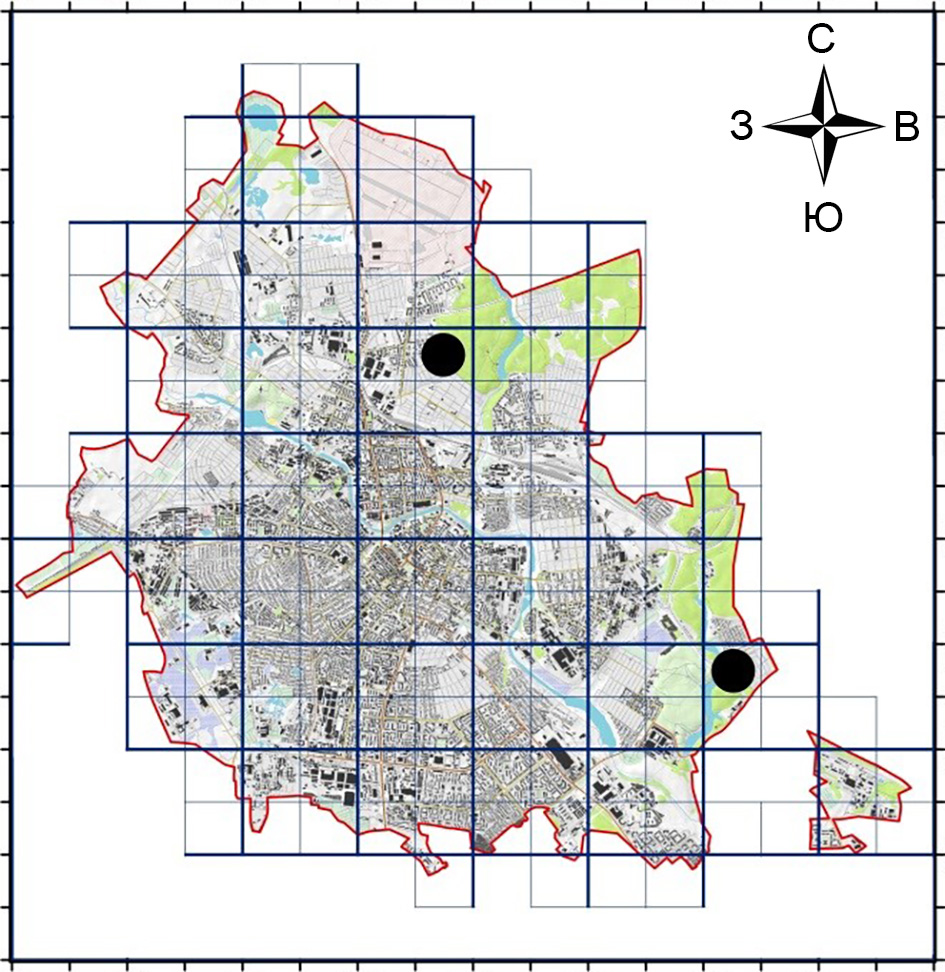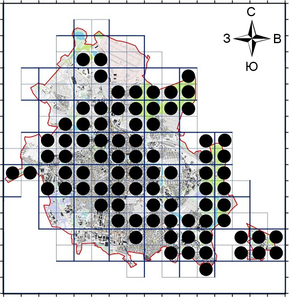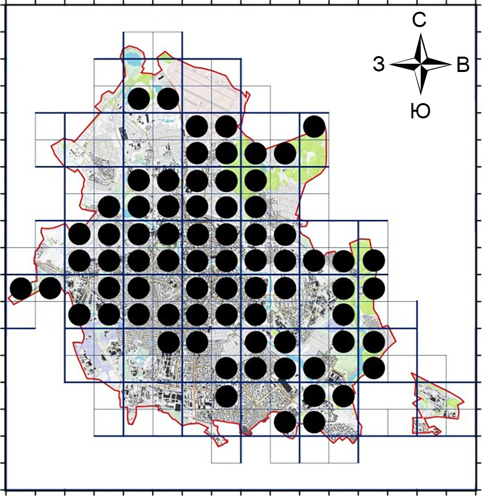 Для объективной оценки распространения инвазионных видов по территории города применялся метод сеточного картирования, который активно используется во флористических исследованиях в последние годы [13–17]. Существенным преимуществом данного метода является то, что покрытие территории сеткой квадратов позволяет равномерно охватить всю территорию города и объективно оценить распространение каждого вида. В качестве картографической основы для схемы сеточного картирования г. Иваново была принята цифровая карта СДВ масштаба 1 : 10 000 использованы ортофотопланы в местной системе координат МСК-37, всего площадь города была разбита на 101 квадрат, площадь каждого квадрата – 1,0 км² [18].