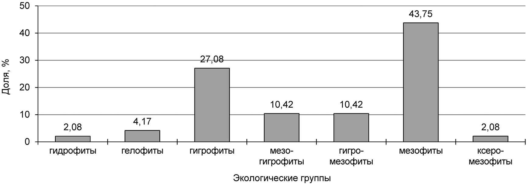 Исследованный экотоп, согласно шкалам Д.Н. Цыганова, характеризуется слабо переменным увлажнением почв со слабо кислой реакцией (рН 5,5–5,6), достаточно обеспеченных азотом и солями и относится к влажно-луговой экологической группе полуоткрытых пространств. Флора полосы обмеления изучена ранее в динамике нескольких лет [9]. В период настоящих исследований в этом экотопе выявлено 48 видов сосудистых растений. Состав экологических групп по отношению к фактору увлажнения разнообразен (рис. 1). Преобладают мезофиты и гигрофиты.