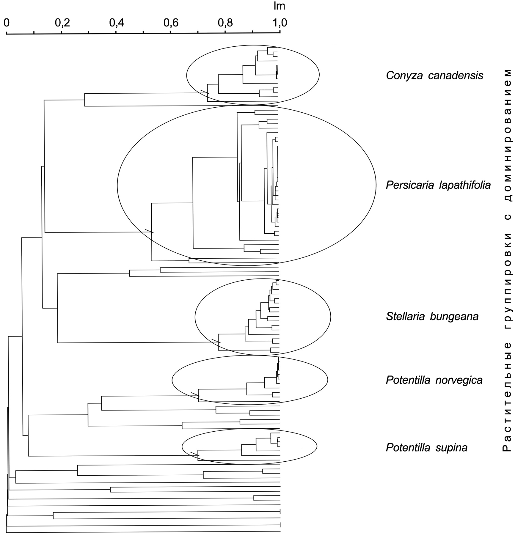 Рисунок 2 – Дендрограмма сходства учетных площадок растительности песчано-каменистой полосы обмеления оз. Б. Миассово, индекс Морисита (Im, UPGMA)